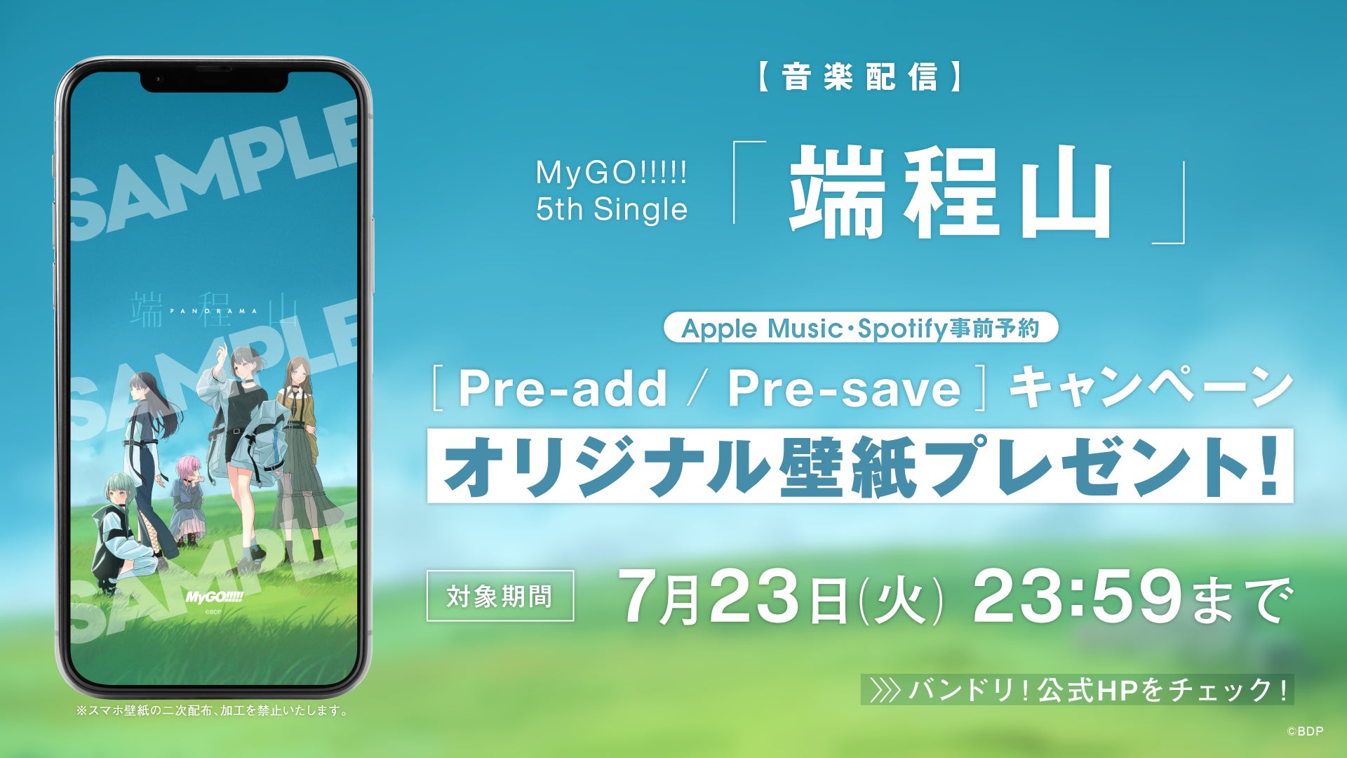 2024年7月24日(水)MyGO!!!!! 5th Single「端程山」のリリースを記念して、Apple Music・Spotify事前予約(Pre-add / Pre-save)キャンペーンを実施いたします。