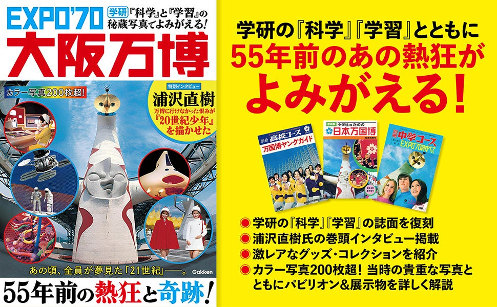 【Gakken大阪万博本】は、1970年当時Gakkenから発売された『学研版 小学生のための日本万国博』『別冊中学コース EXPO'70のすべて』『別冊高校コース 万国博ヤングガイド』と、その制作のために撮影された秘蔵写真をもとに大阪万博を振り返る一冊です。2025年3月の発売から評判を呼び、重版を重ねています。