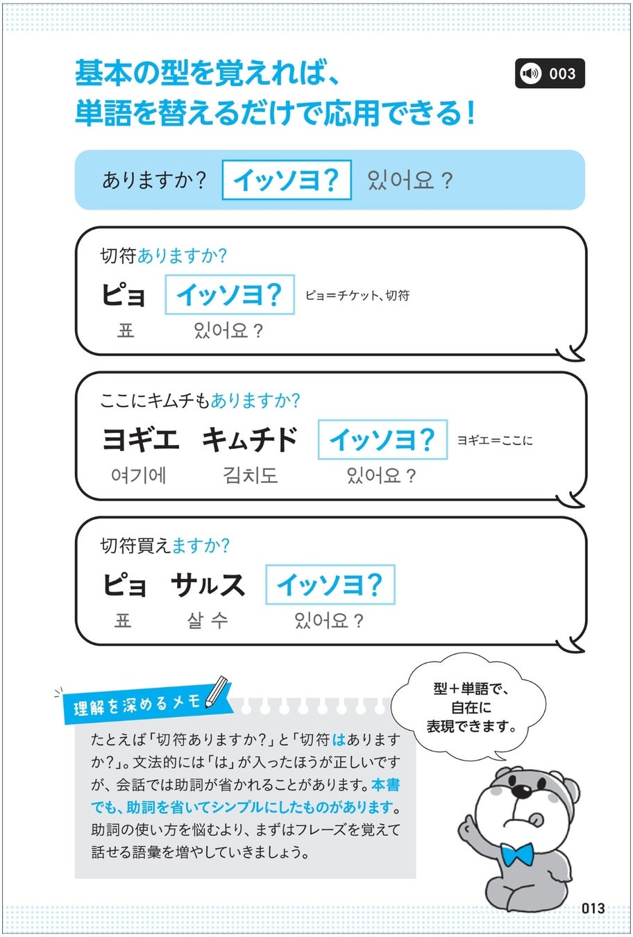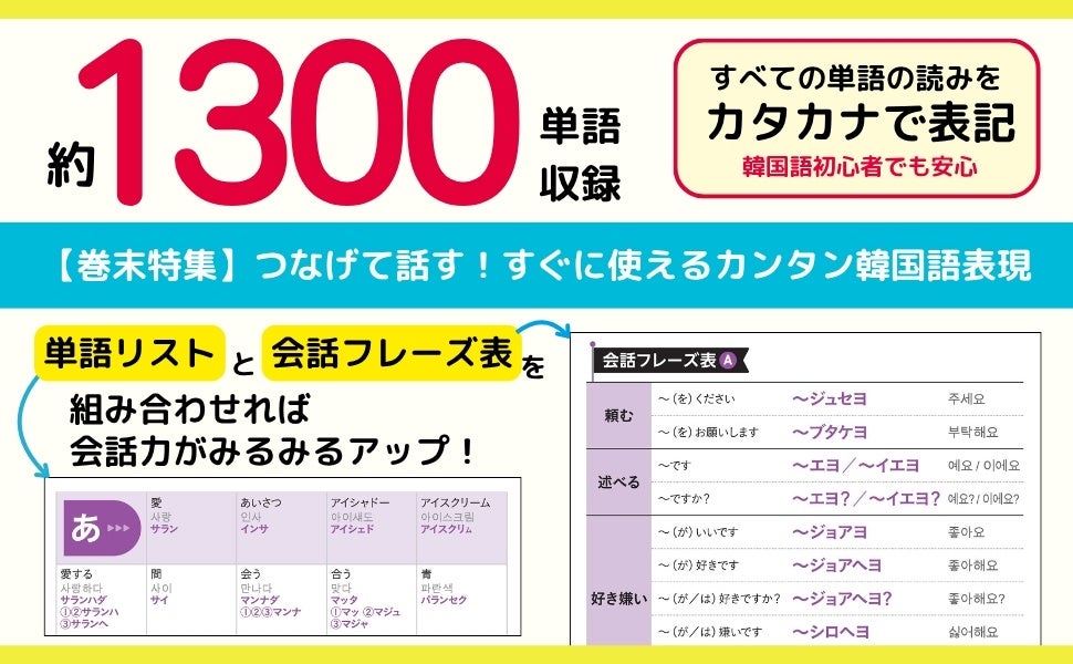 韓国語を勉強しているけど、実際に話すとなるとハードルが高い……それって、すごく長い文章を話そうと思っていませんか? コミュニケーションツールとしての会話を楽しむには、3語もあれば十分。本書には、すべて3語(以内)で言える全780例文を収録しています。全フレーズに、カタカナの読み方と音声※2がついているので、初心者でも話すことができます。