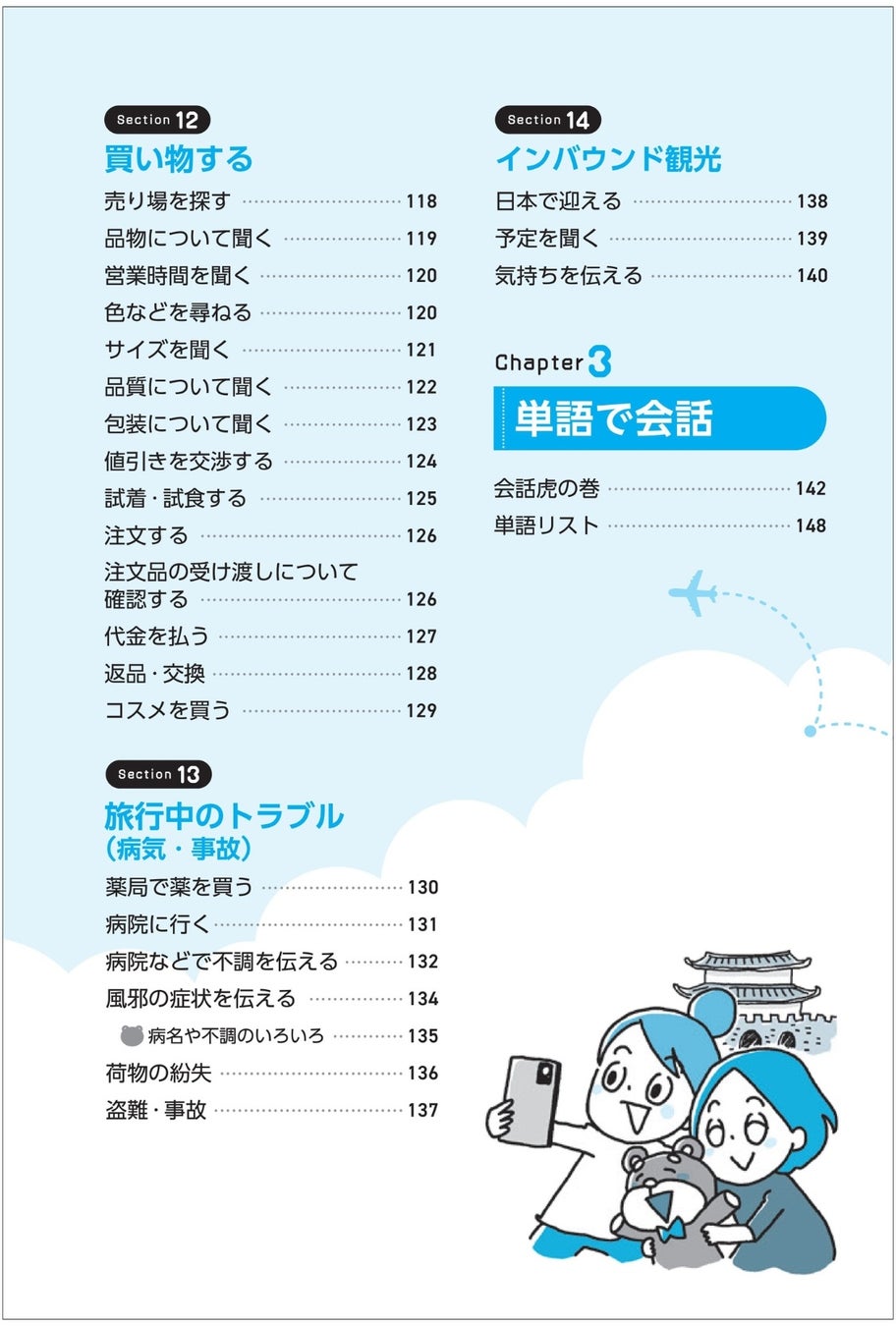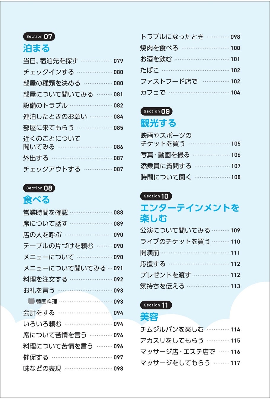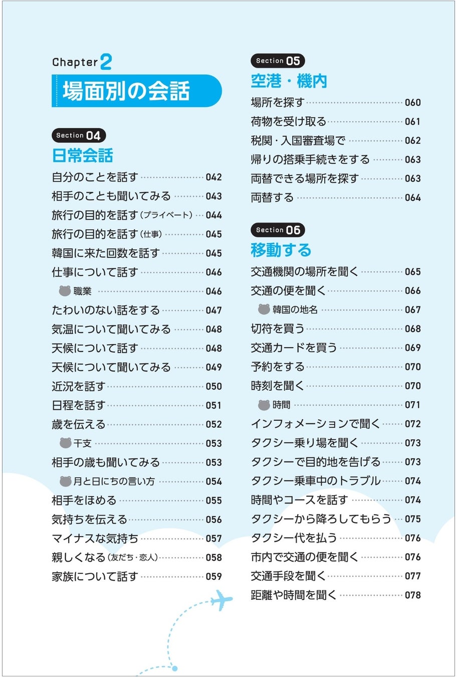 渡航から宿泊、食事、買い物、娯楽、病院、薬局、ホテル、トラブル対応まで、韓国旅行での場面を想定した会話を収録しています。さらに「自分のことを話す」「友だちになる」といったコミュニケーシ
