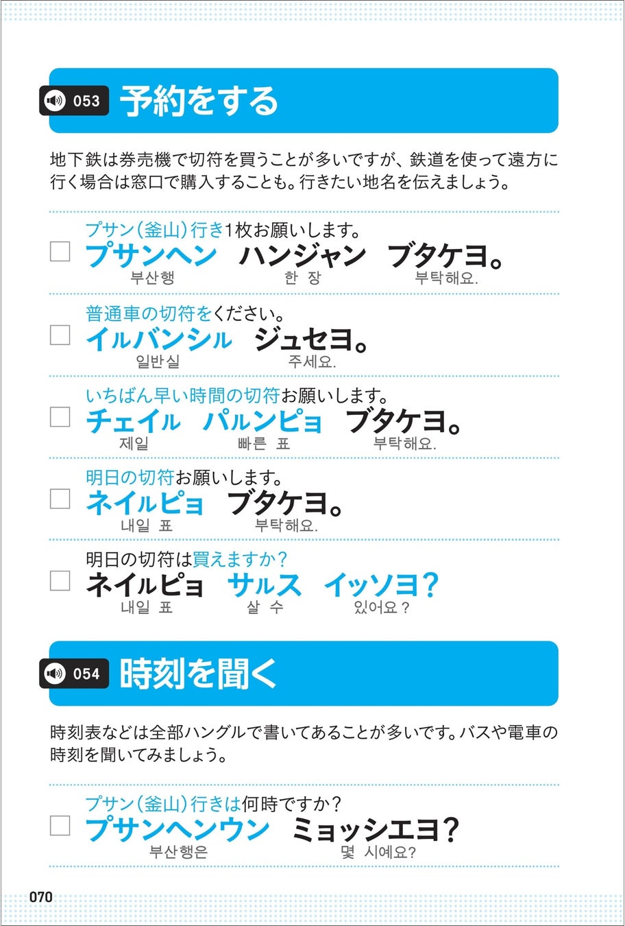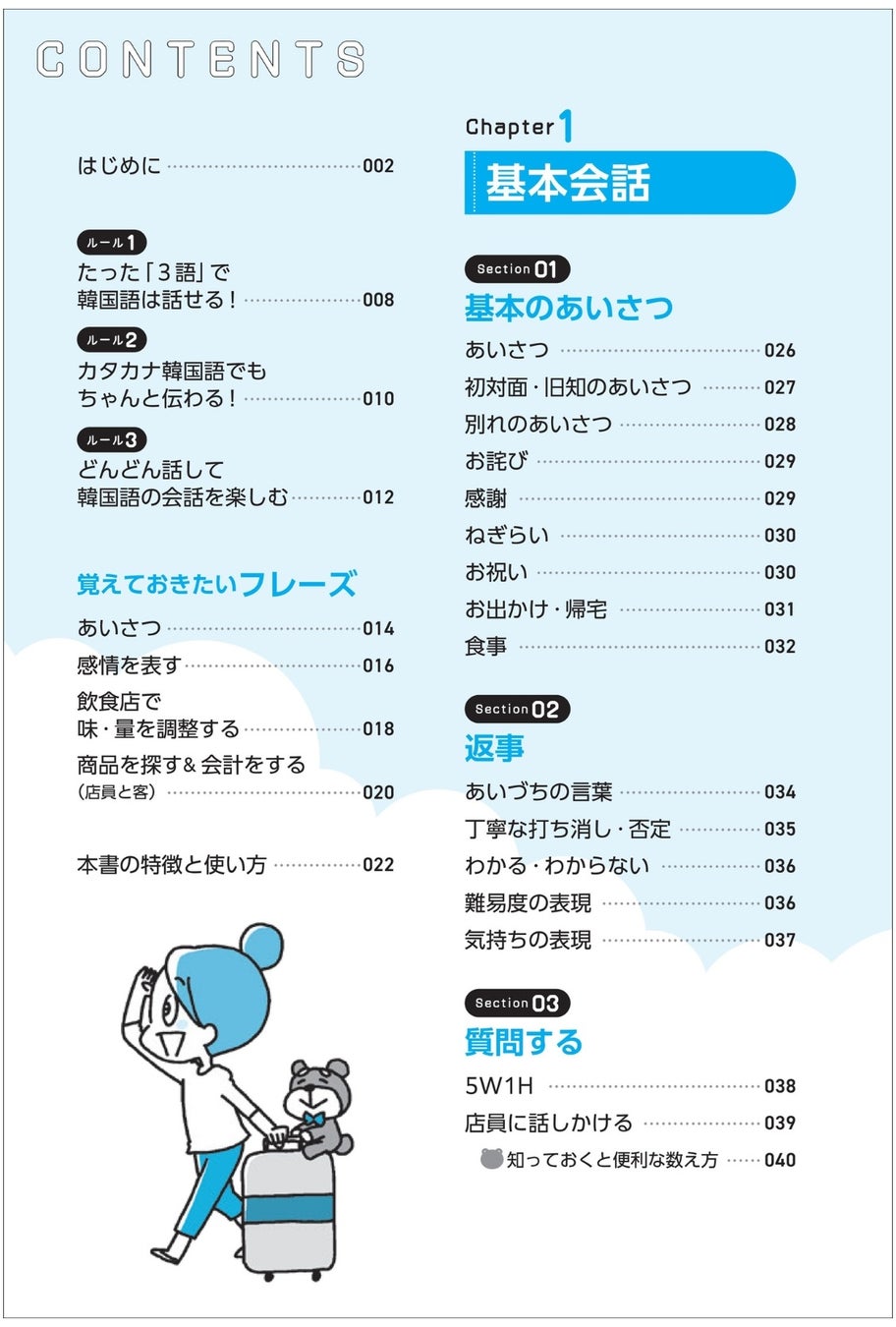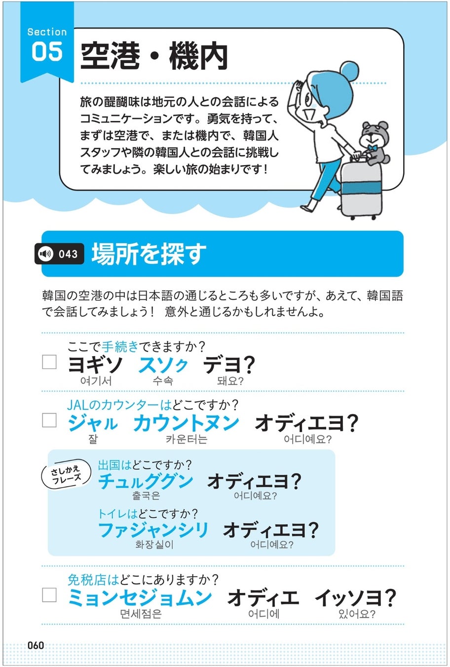 渡航から宿泊、食事、買い物、娯楽、病院、薬局、ホテル、トラブル対応まで、韓国旅行での場面を想定した会話を収録しています。さらに「自分のことを話す」「友だちになる」といったコミュニケーシ