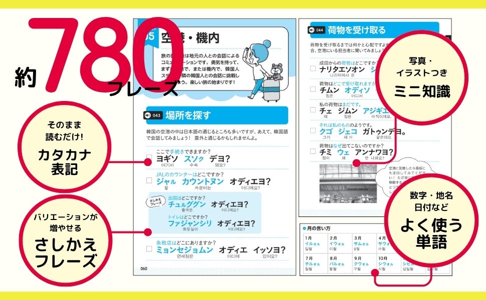 韓国語で会話を楽しむには、3語あれば十分! 渡航から宿泊、食事、買い物、病院、ホテル、トラブル対応まで、韓国旅行のあらゆるシーンで使えるフレーズ集。カタカナを読むだけだから韓国語初心者にもおすすめ。
