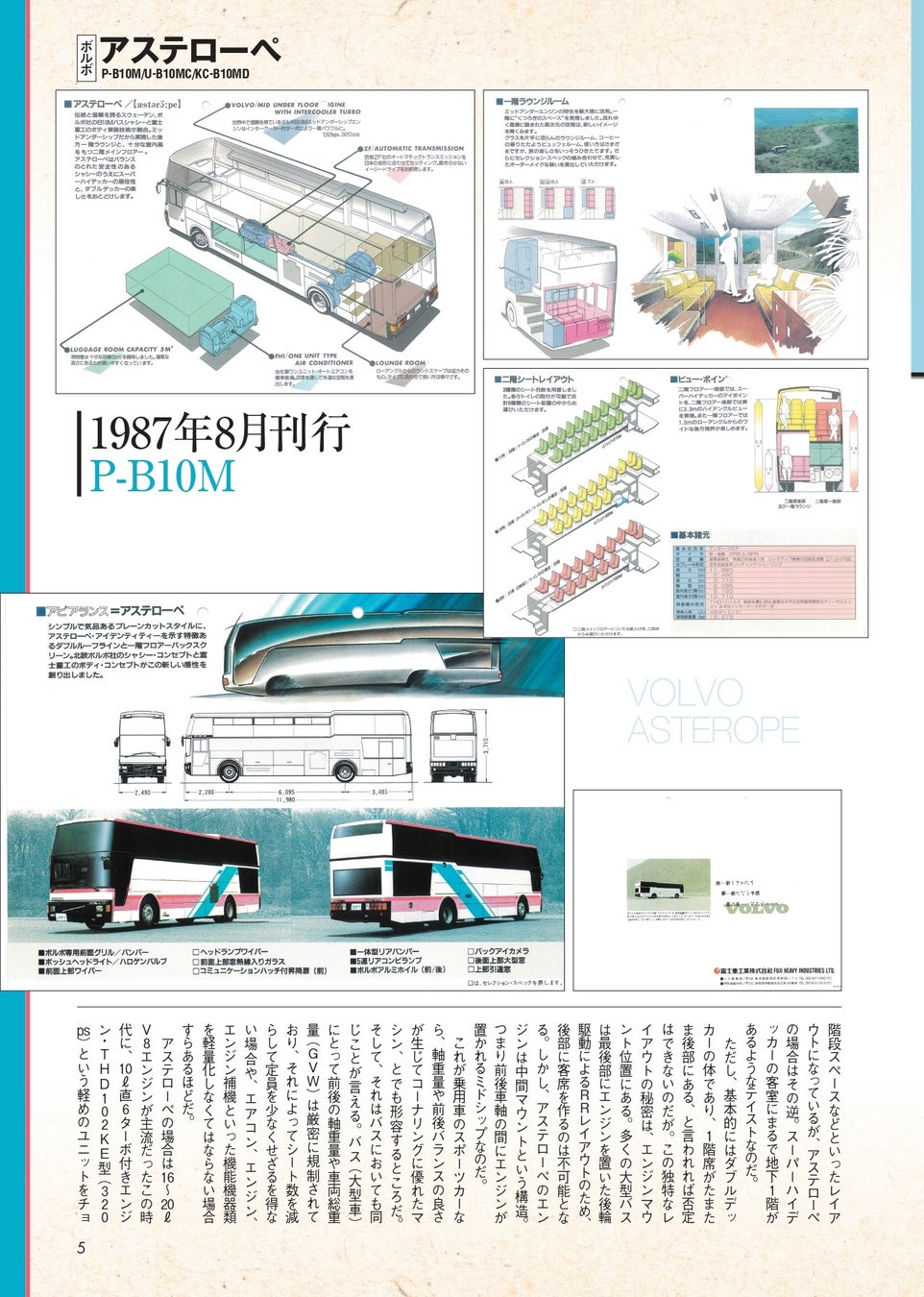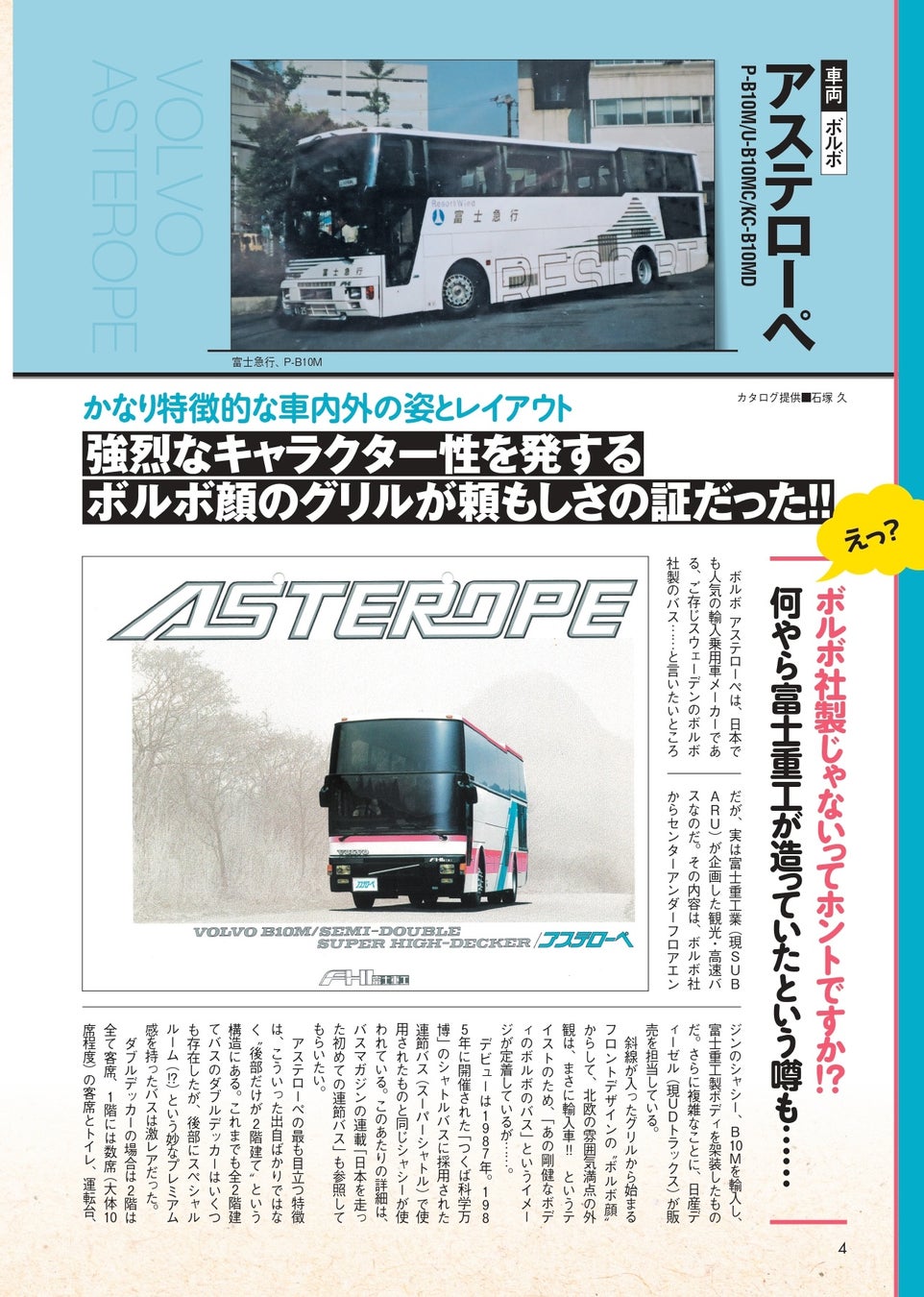 ボルボ アステローペのカタログがバスマガジンで掲載されたことはなく、実は本書が初めての掲載となる。その特徴的な車内外の姿とレイアウト、それに加えて特徴的な「ボルボ顔」が強烈に個性を主張している。