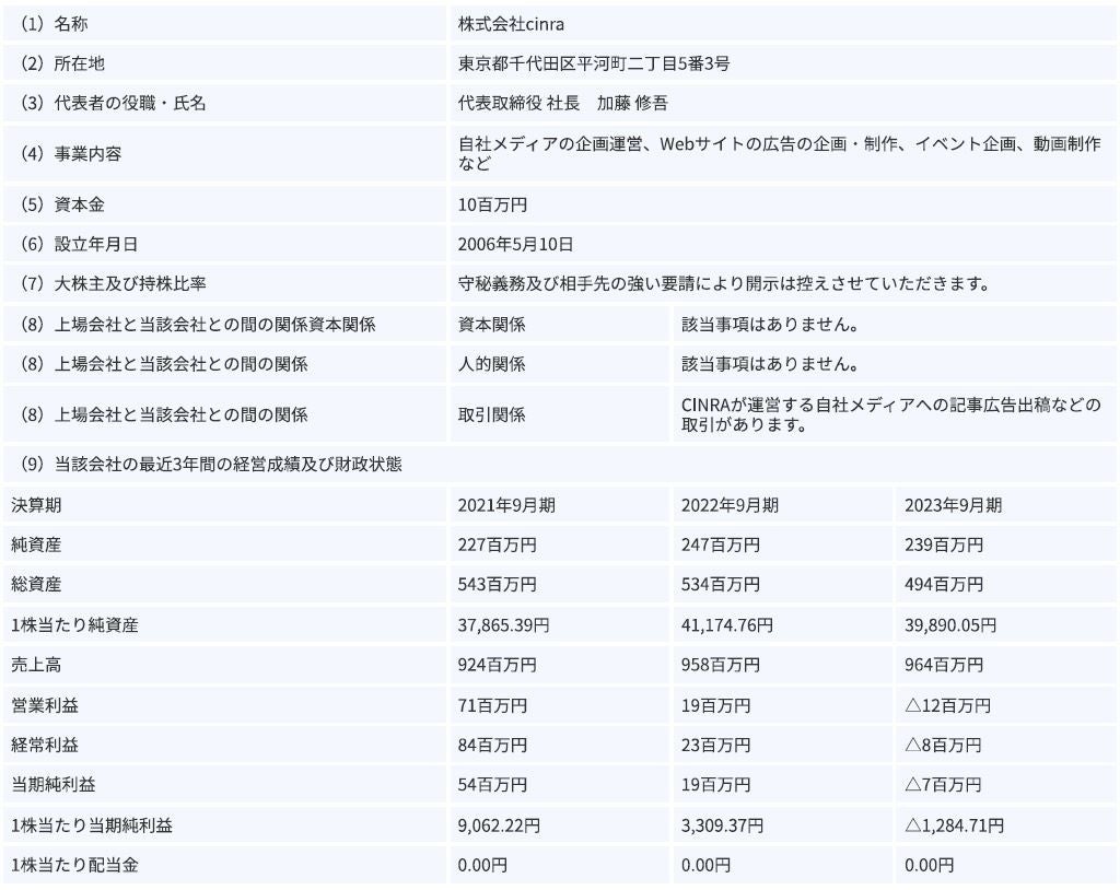 当社グループは、中⻑期的な成⻑の実現を⽬指すため、2023年3⽉より既存事業の強化や新規事業創出等を⽬的とした投資を開始しております。今回、CINRAを当社グループに迎え⼊れることにより、デジタルマーケティングのさらなる成⻑と事業価値の最⼤化が⾒込めると判断し、株式取得を決定しました。
