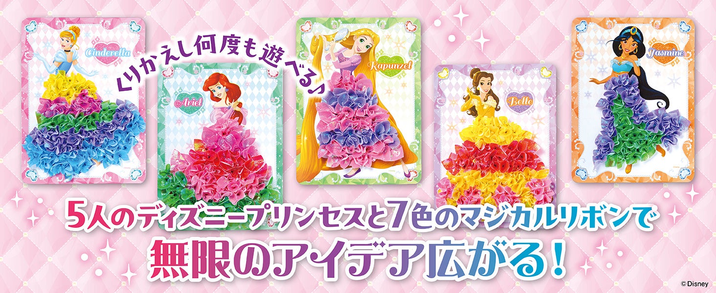 ドレスデザインボードは、アリエル・ラプンツェル・シンデレラ・ベル・ジャスミンの5種類。キラキラでカラフルな7色のリボンがたっぷり入っているので、デザインの種類は無限。創造力を大きく刺激してくれます。一度完成させた後にはリボンを取り外すこともできるので、くりかえしあそべます。