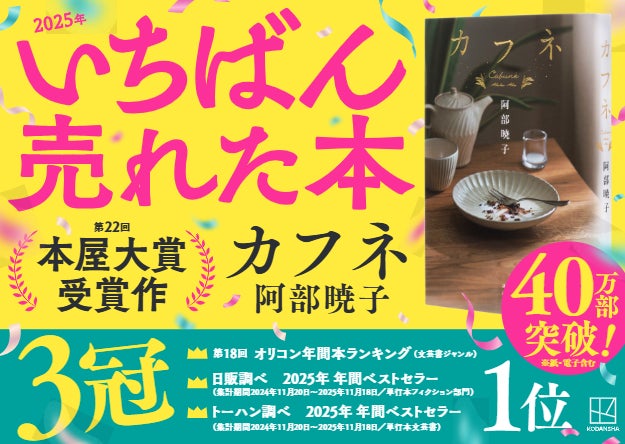 累計40万部(紙・電子含む)を突破した第22回本屋大賞受賞作『カフネ』が、トーハン・オリコン・日販の主要書籍ランキングで1位を獲得。単行本フィクション分野で2025年もっとも売れた小説となりました。