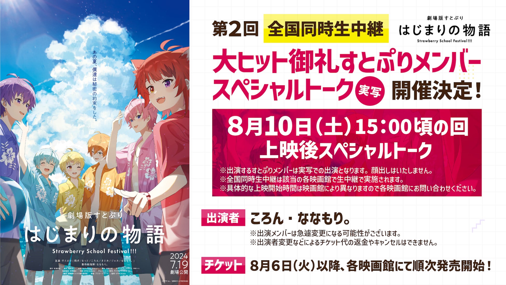 2024年7月19日(金)より公開いたしました『劇場版すとぷり はじまりの物語~Strawberry School Festival!!!~』は、第2回 全国生中継 大ヒット御礼すとぷりメンバースペシャルトーク(実写)を開催いたします。