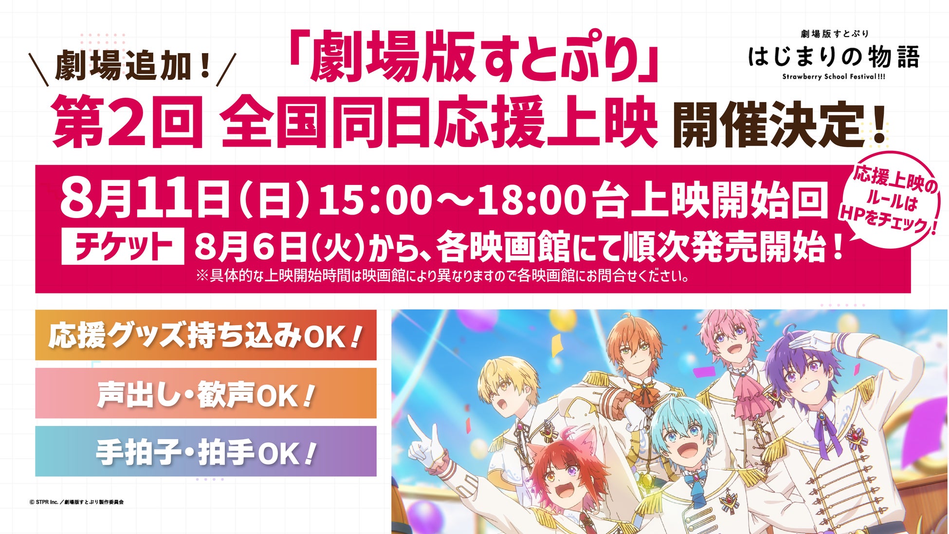 2024年7月19日(金)より公開いたしました『劇場版すとぷり はじまりの物語~Strawberry School Festival!!!~』は、8月11日(日)に第2回全国同日応援上映を開催いたします。