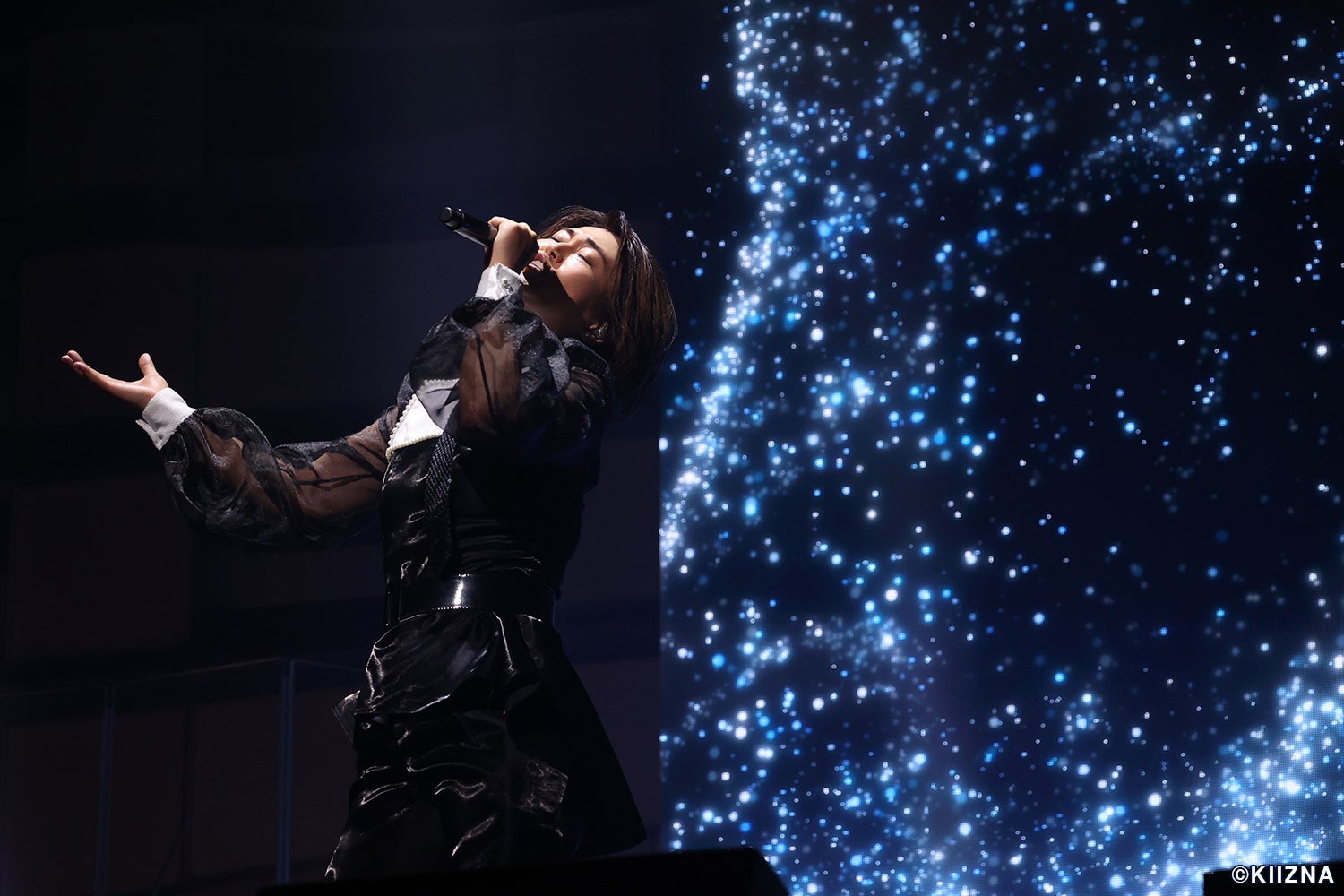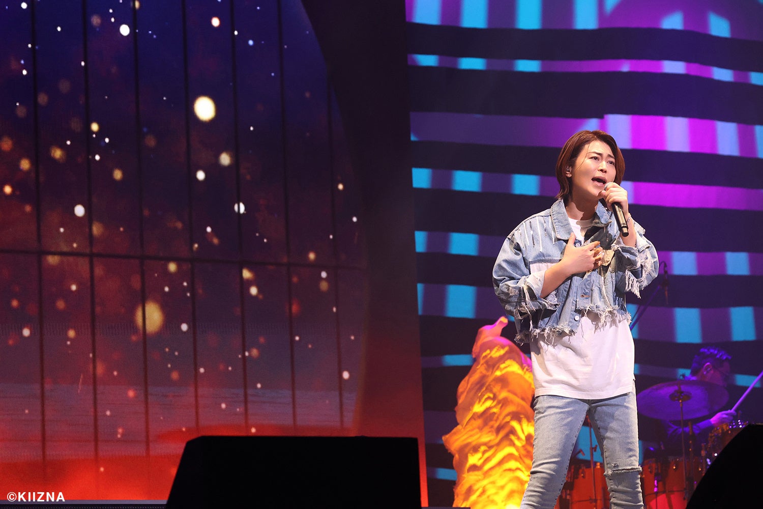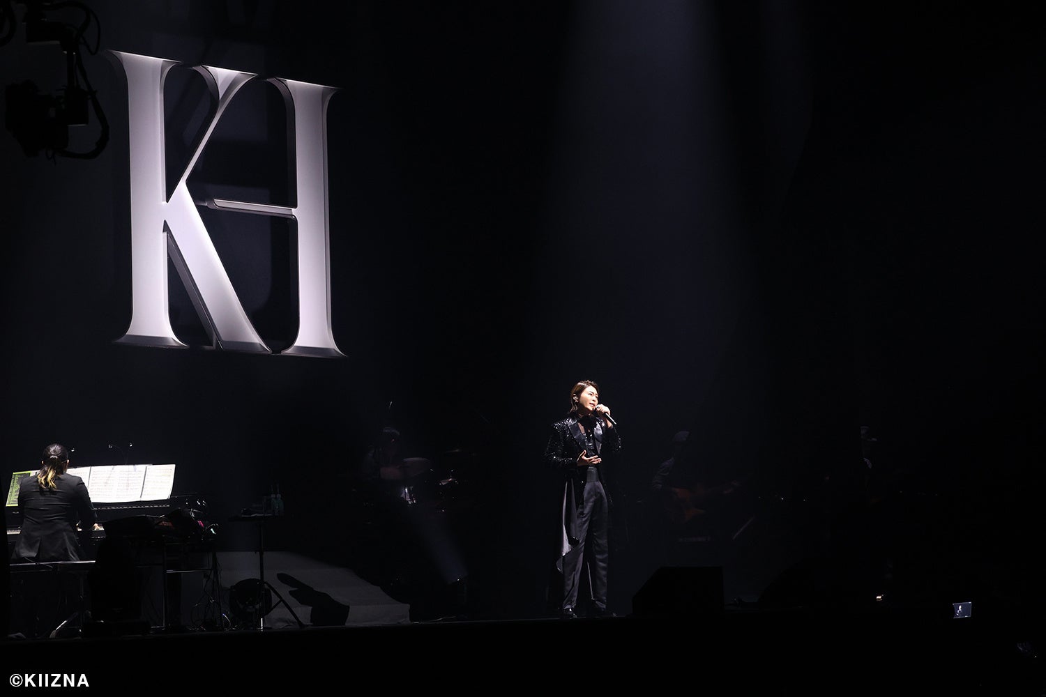 定刻を過ぎると場内が暗転し、ゆっくりと幕が上がる。6500人もの大観衆の拍手と声援を浴びて、スパンコールをあしらった黒いスーツ姿の氷川が中央に立つ。1曲目は、先の見えない不安の中でも共に歩いていくと約束した「WALK」。シンフォニックな調べに乗せて、氷川が“KIIZNA=絆”を贈る。「僕と私の1ページ」では、積み重ねて来た日々を振り返り頷く。氷川の表明とも言える2曲から、名匠・佐藤準との共作「泣けてくるけど 笑えてくるの♡」、ラテンフレーバーな「Happy!」を続ける。ポップミュージックの魔法で、会場中を共感で満たしていく。