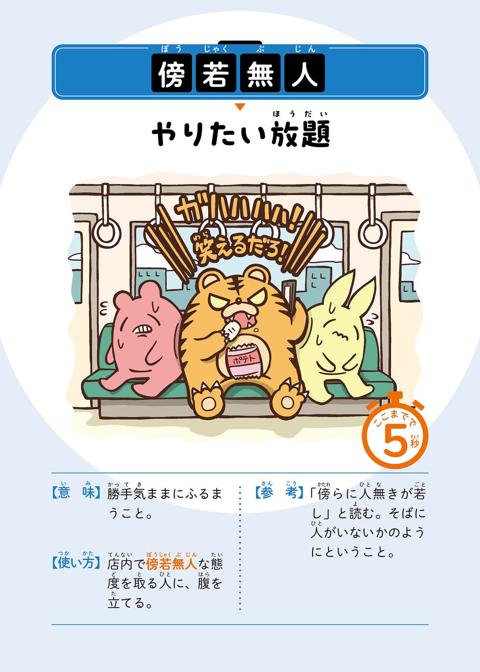 所要時間は1語につきたった5秒! 言いかえとイラストを見れば、すぐに言葉の意味がつかめます。たった5秒なので、読書や勉強が苦手な方でも大丈夫! 二学期からことわざの授業が始まる小学校3年生のお子さんや、中学受験に向けてがんばっている方、さくっと学びなおしたい方にもおすすめです。