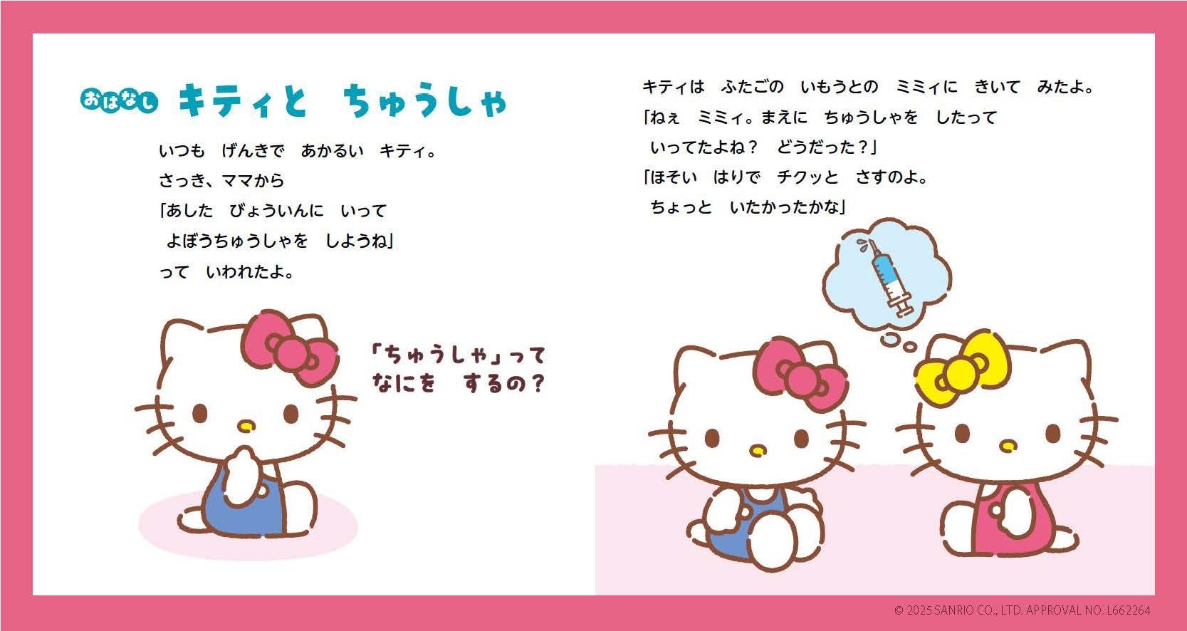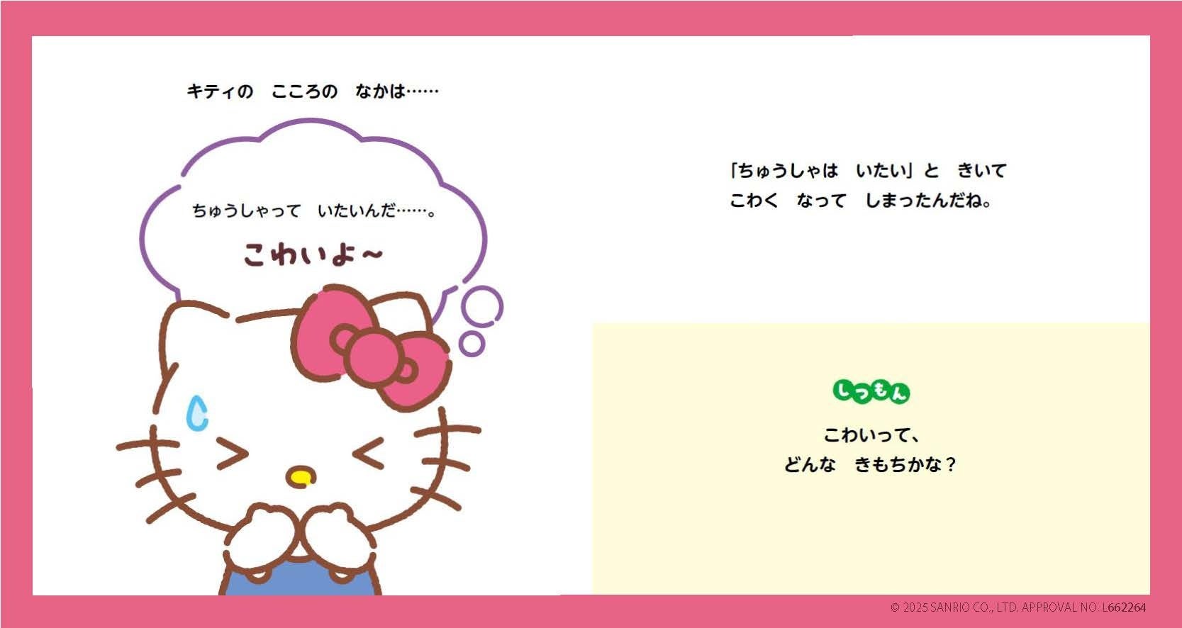 【おはなし】……気持ちを知るための物語です。「注射はいたい」と聞いてこわくなってしまったキティが、家族に協力してもらいながら、「こわい」気持ちを乗り越えていきます。お子さまは、キティと一緒に「こわい」気持ちについて考え、気持ちの対処法を学ぶことができます。