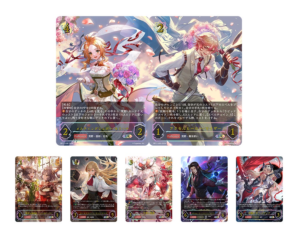 本商品には『優美な猫姉妹・シャム&シャマ』、『カースドクイーン・ナハト・ナハト』、『アクセルヒーロー・マイザー』、『万華の鳳凰』、『カオスルーラー・アイシィレンドリング』、『メルティングシュガー・セリーナ』、『均衡の刃・シルヴィア』の7種のURカードが収録!