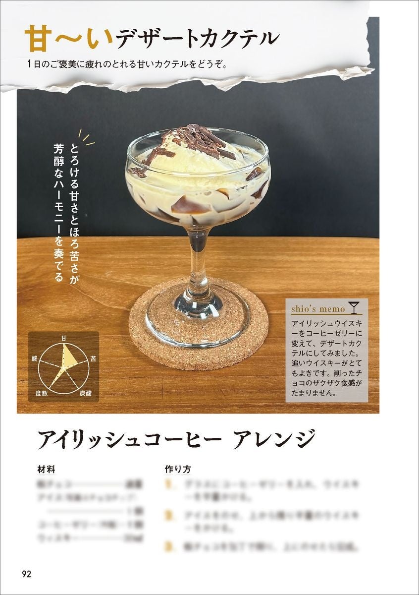 また、いわゆる「カクテル本」は「お酒ベース」での掲載が基本ですが、本書は「味ベース」ごとに掲載! 「甘×甘」「甘×酸」「すっきり」「ほろにが」「フルーティー」「ピリ辛」など……カクテル初心者さんでも、今日の夕飯に合うカクテルや今の気分に合ったカクテルが簡単に探せます!