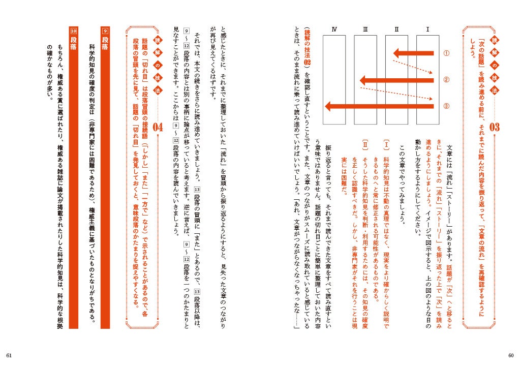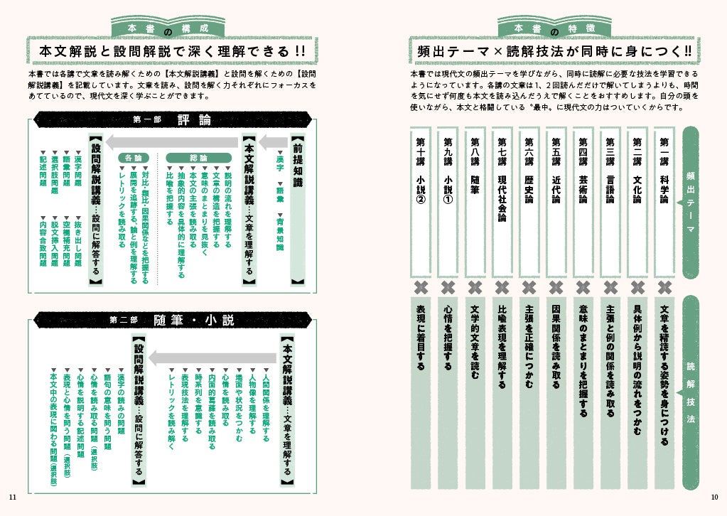 さらに、各講では「因果関係を読み取る」「比喩表現を理解する」などといった、現代文を攻略する上で必要な読解の技法をテーマに据え、頻出テーマを学ぶと同時に読解技法が学べるようになっています。まさに、一石二鳥の参考書となっているのです。