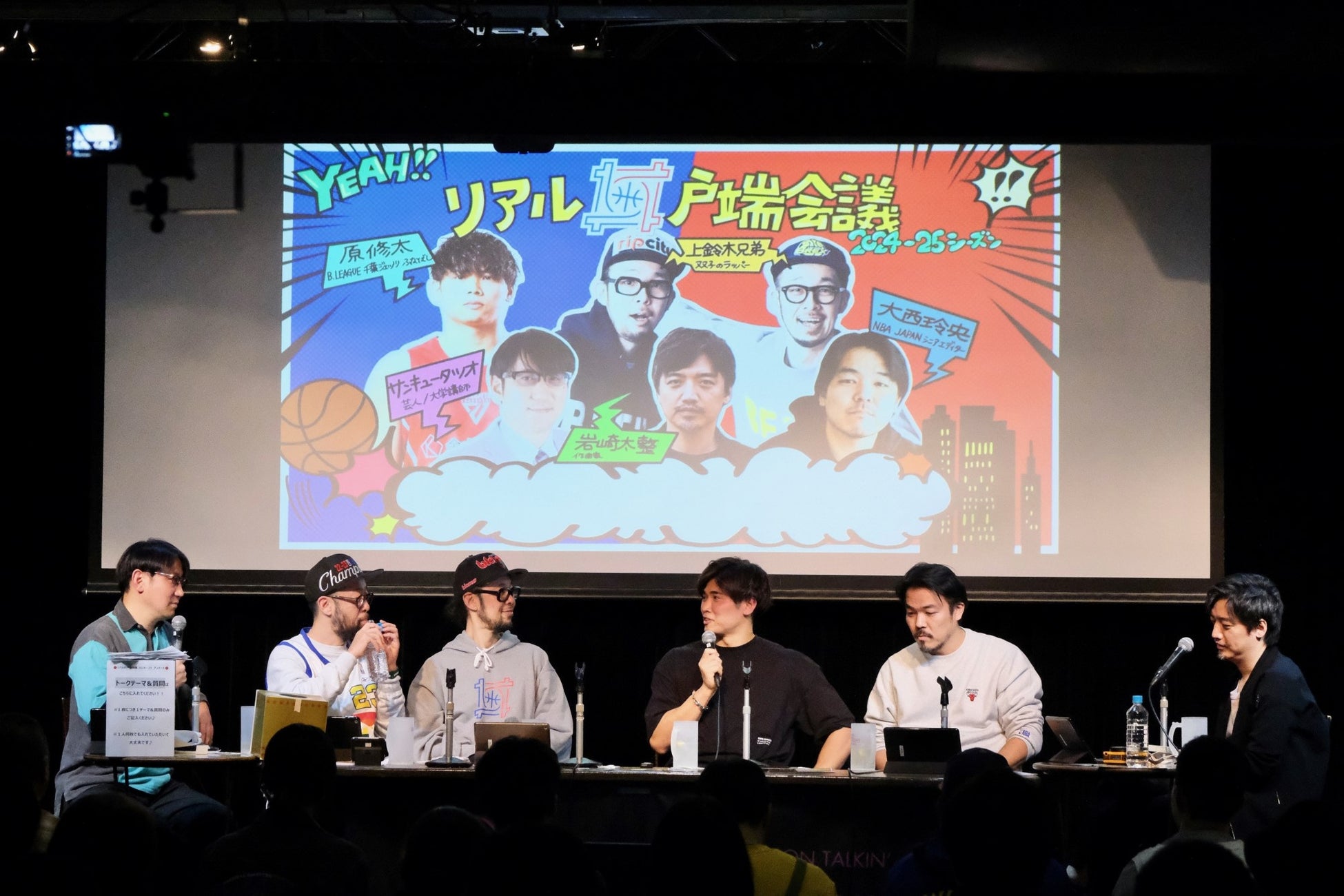 昨年に引き続き、今回も配信プラットフォーム「ZAIKO」でのライブ配信とのハイブリッド開催となった今年の「リアル井戸端会議」では、通常の配信でもおなじみの岩崎太整(作曲家)、サンキュータツオ(芸人/大学講師)、上鈴木兄弟(双子のラッパー)、大西玲央(NBA Japanシニアエディター)がNBAに関する様々なトピックについて軽妙なトークを繰り広げた。イベントの途中にはB.LEAGUEで実況も務める永田実、ワシントン・ウィザーズの「公認スーパーファン」でグラフィックデザイナーのMQも急遽登壇しNBAファンたちと交流した。