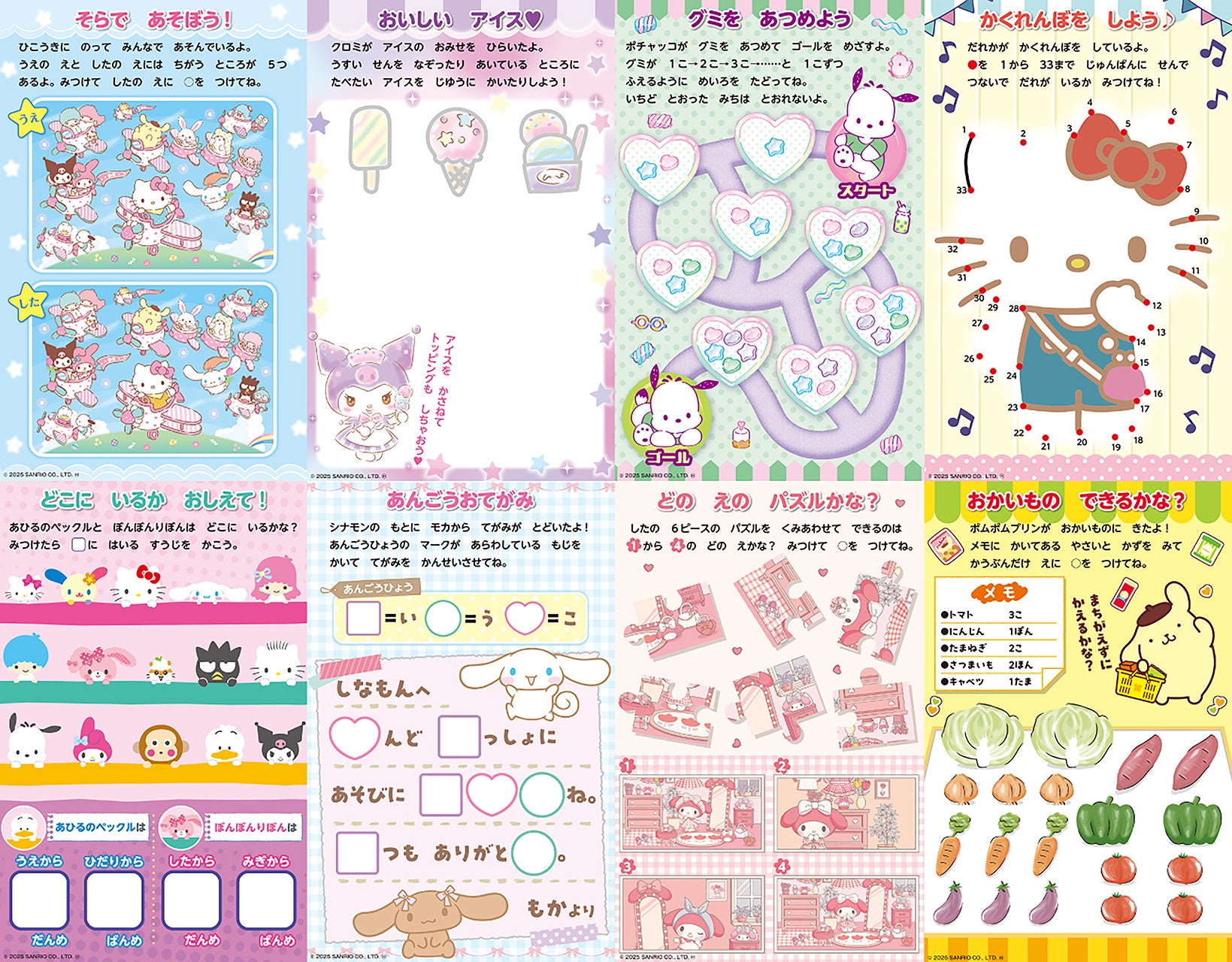 「ハローキティ」「マイメロディ」「クロミ」「シナモロール」「ポムポムプリン」「ポチャッコ」など、子ども人気の高いキャラクターはもちろん、「リトルツインスターズ」「ハンギョドン」「タキシードサム」「あひるのペックル」「バッドばつ丸」「けろけろけろっぴ」「みんなのたあ坊」「ぐでたま」など、親世代にとっても懐かしく親しみ深いキャラクターたちがたくさん登場! 親子で楽しみながら取り組むことができます。