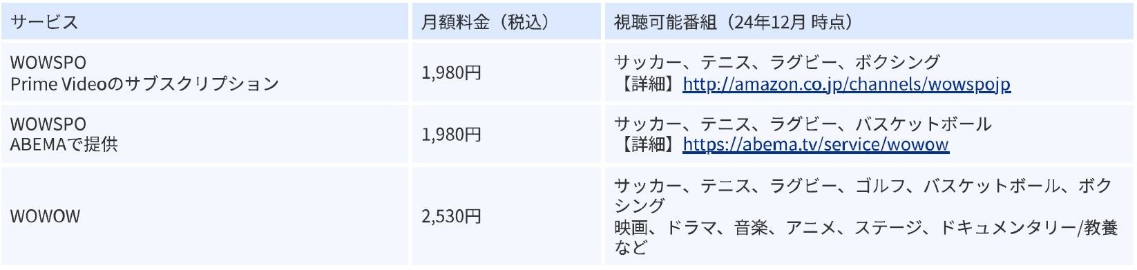 ・「WOWSPO(Prime Videoのサブスクリプション)」は「WOWSPO(ABEMAで提供)」や「WOWOW」とは提供番組やサービス内容が異なります。