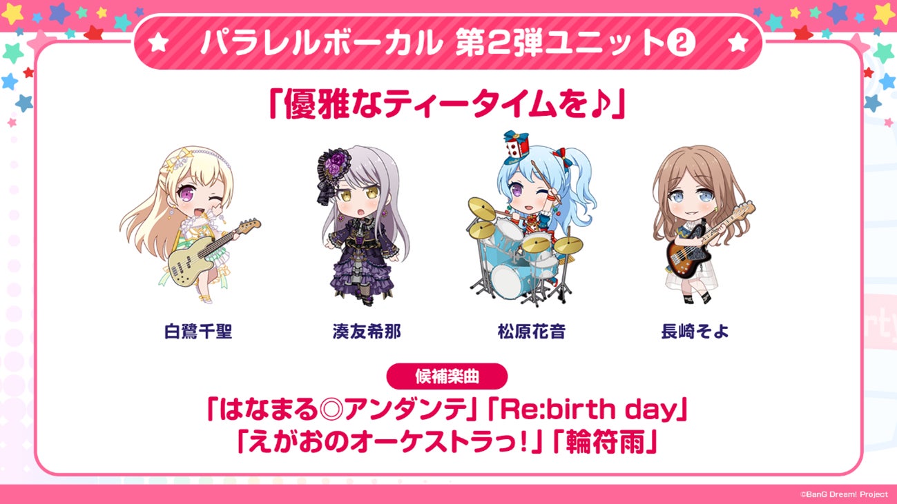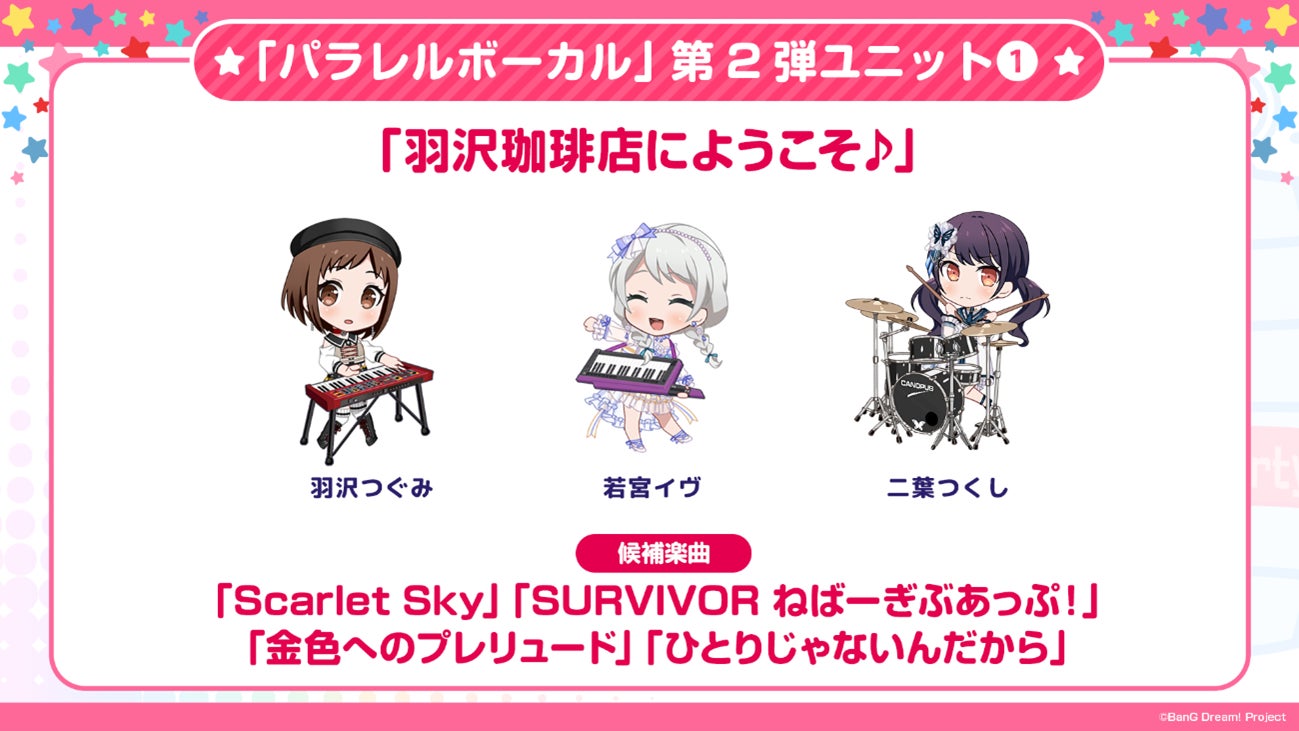 パラレルボーカル第1弾ユニット「あこがれの共演」(メンバー:戸山香澄、美竹蘭、ロック、椎名立希)の歌唱楽曲は『迷星叫』に、「I♡インドア」(メンバー:市ヶ谷有咲、白金燐子、倉田ましろ)の歌唱楽曲は『Blessing Chord』に決定いたしました。