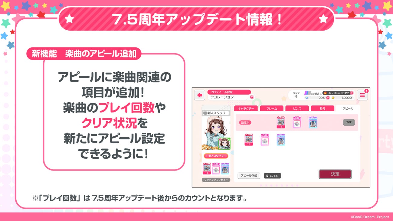 プロフィールのデコレーションで設定できる「アピール」にて、楽曲のプレイ回数や、楽曲ごとのフルコンボやオールパーフェクトなどクリア状況のアピールを作成できるようになります。