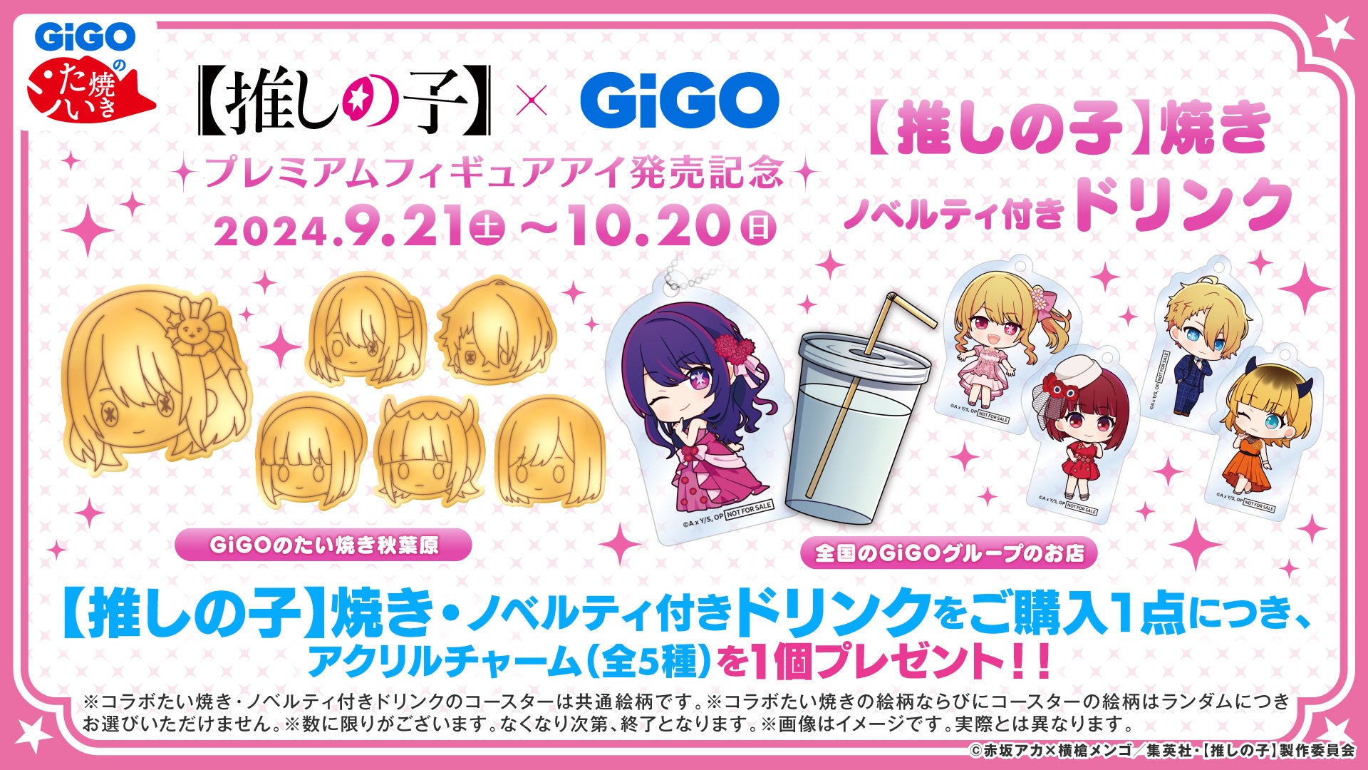 対象のGiGOグループのお店にて『【推しの子】×GiGO プレミアムフィギュアアイ発売記念プライズキャンペーン』の開催が決定!プライズ景品に加えて【推しの子】焼き&ノベルティ付きドリンクの販売を行います。