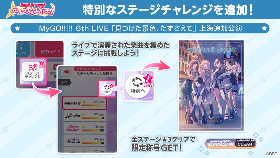 スマートフォン向けゲーム「バンドリ! ガールズバンドパーティ!」内、ステージチャレンジ「特別」に、本ライブで演奏された楽曲を集めたステージを追加しました。