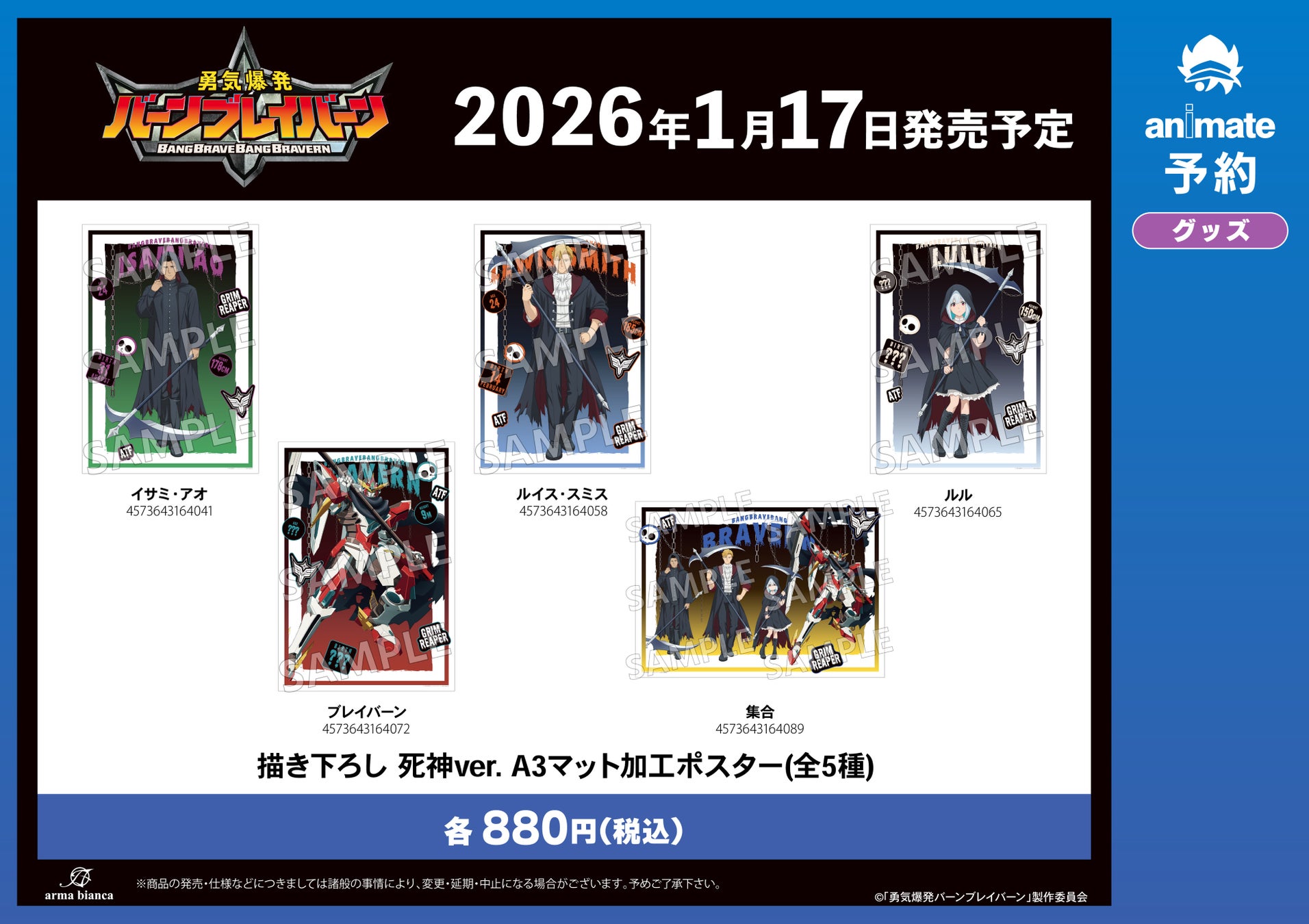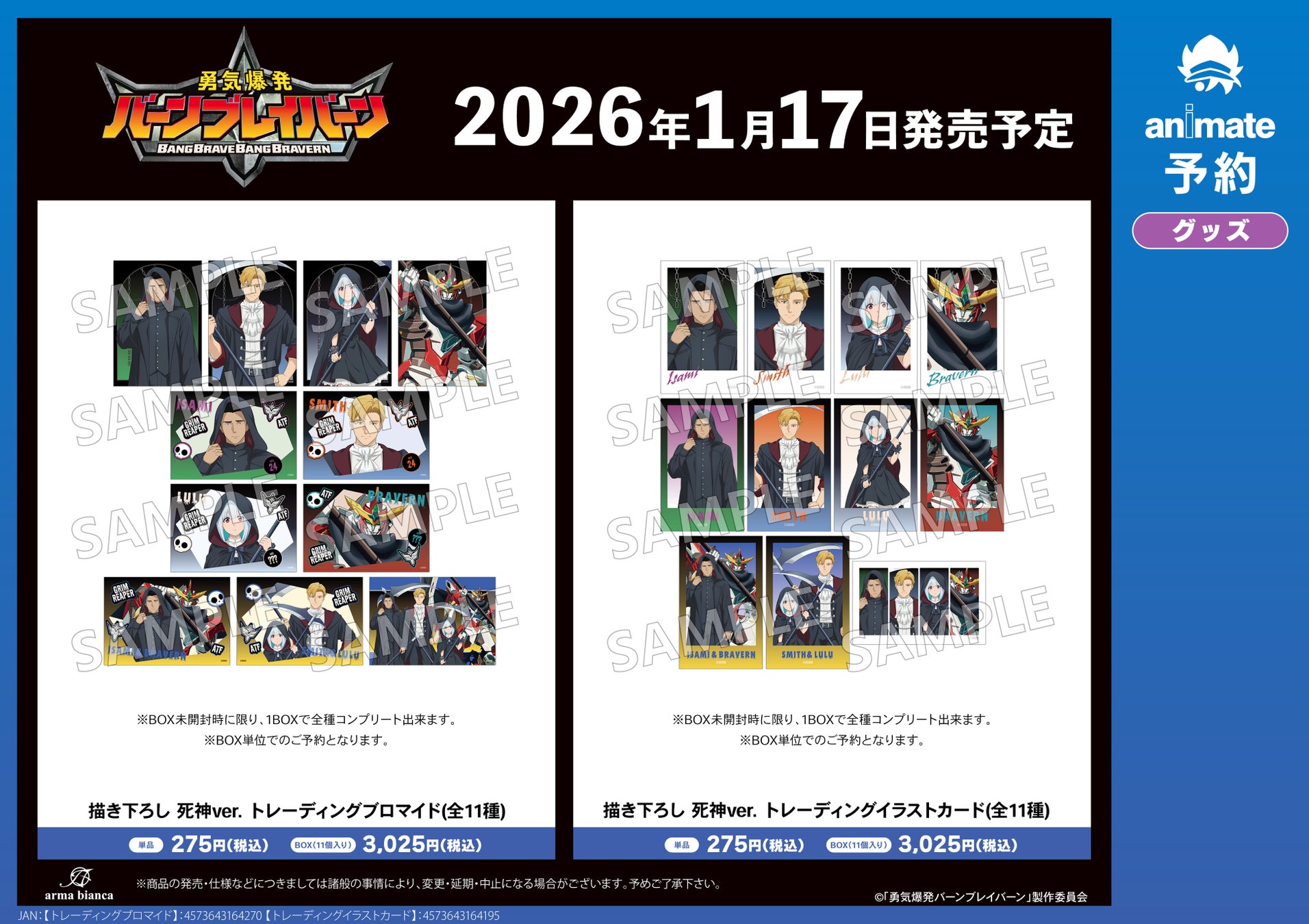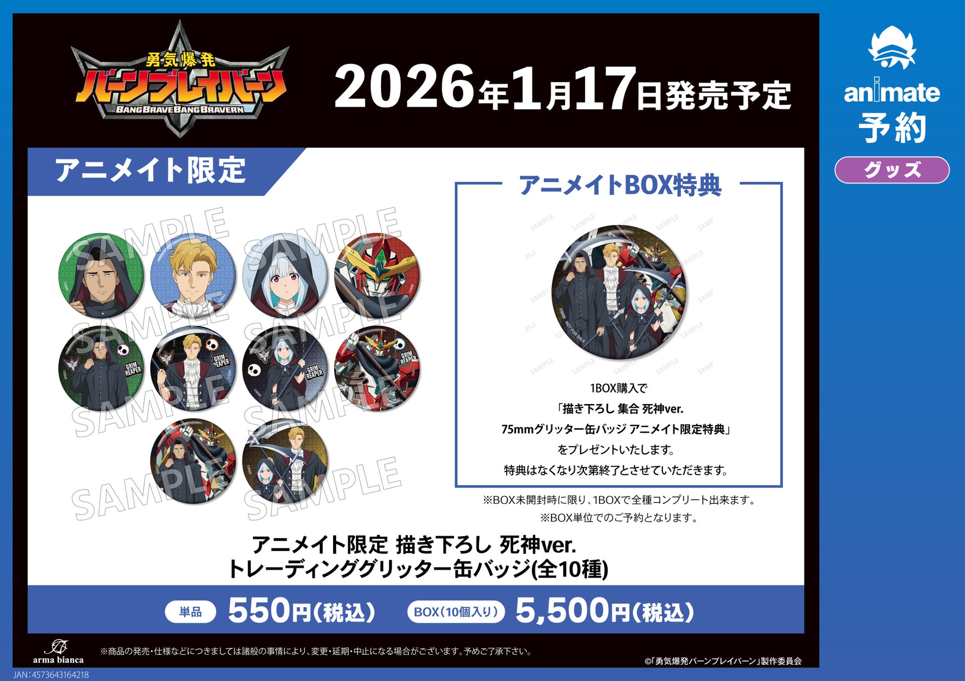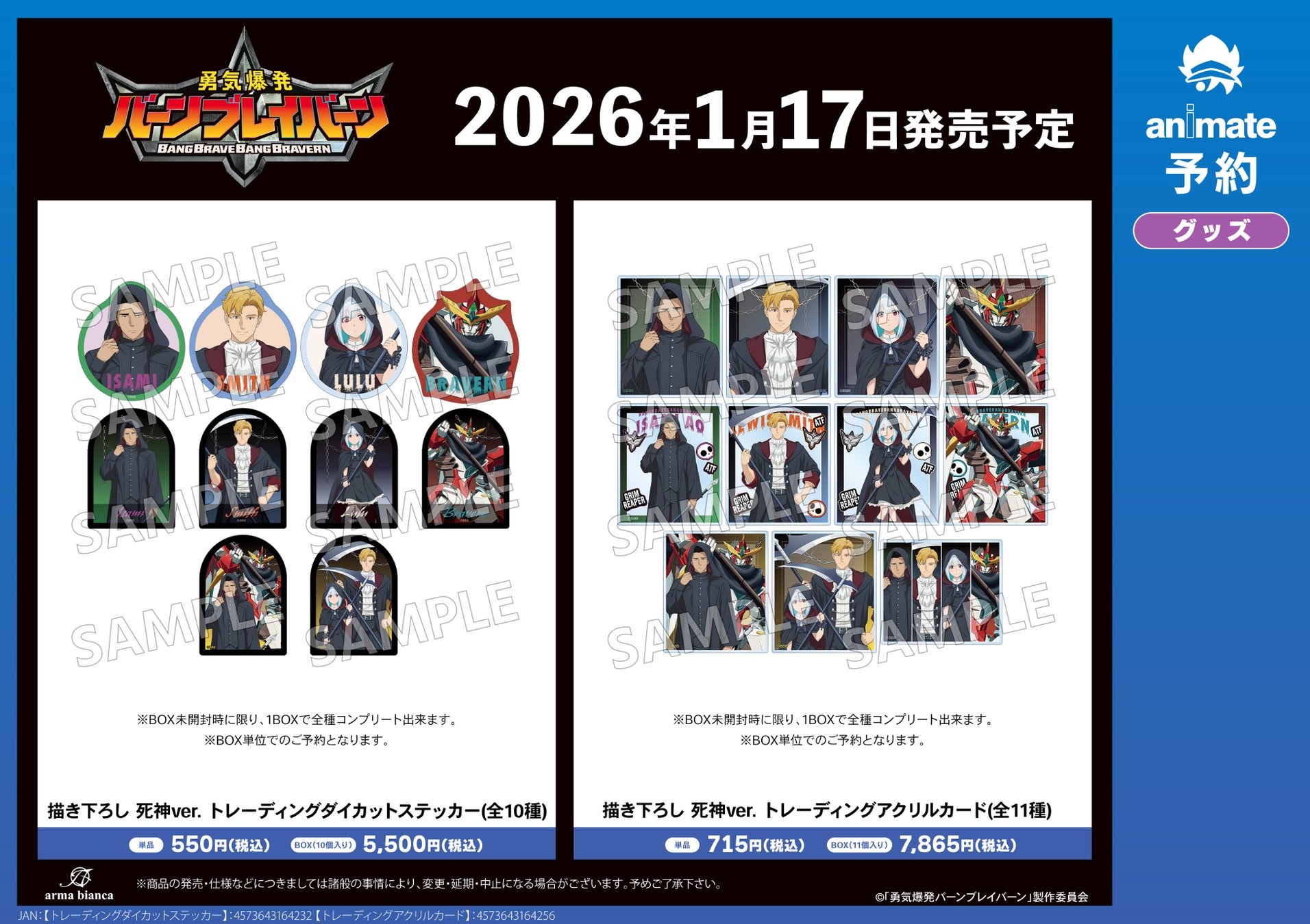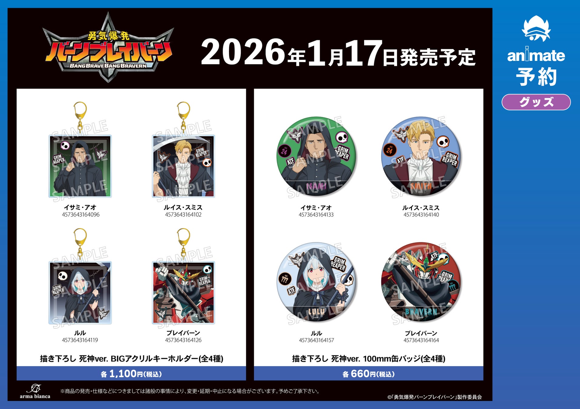 今回のフェアでは、オリジナルTVアニメ「勇気爆発バーンブレイバーン」の「死神」をコンセプトにした新規描き下ろしイラストを使用した新商品の先行予約を実施する他、フェア特典を予定しております。
