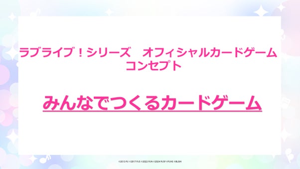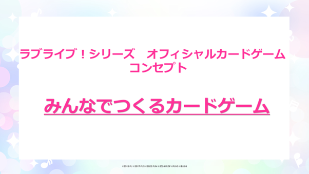 ルールの一部や、今後の登場スクールアイドルなど、このカードゲームの未来を皆様と一緒につくっていきたい、その思いからこのコンセプトになっております。
