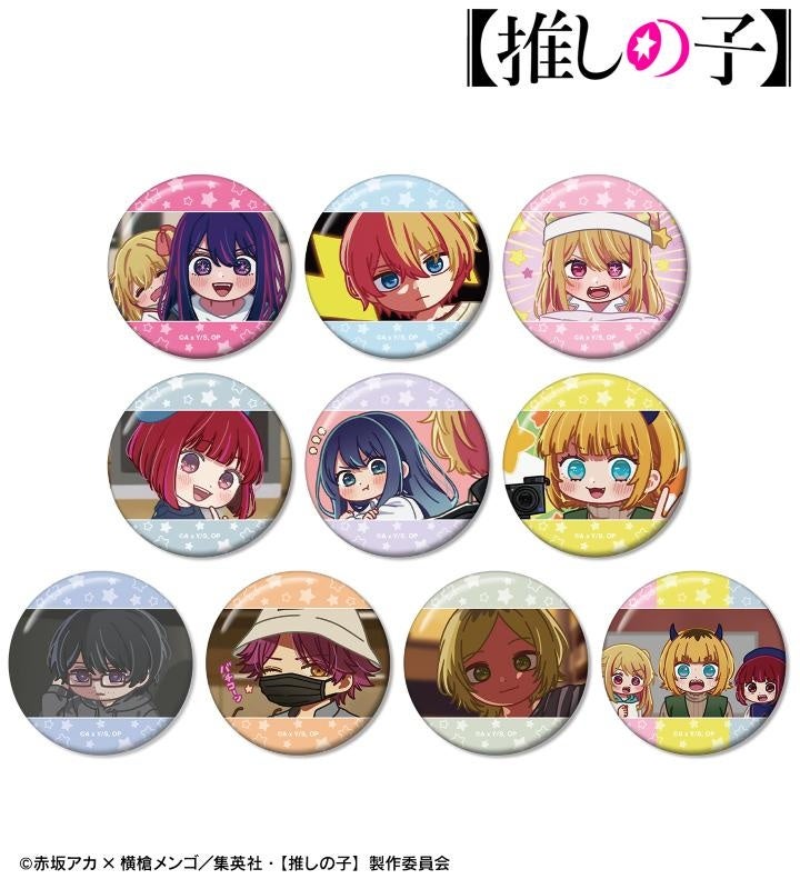 アイ、アクア、ルビー、有馬かな、黒川あかね、MEMちょ、姫川大輝、鳴嶋メルト、鴨志田朔夜の印象的なシーンのゆるコマイラストを、缶バッジに仕上げました。