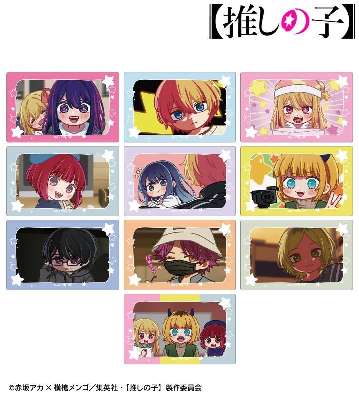 アイ、アクア、ルビー、有馬かな、黒川あかね、MEMちょ、姫川大輝、鳴嶋メルト、鴨志田朔夜の印象的なシーンのゆるコマイラストを、カードステッカーに仕上げました。
