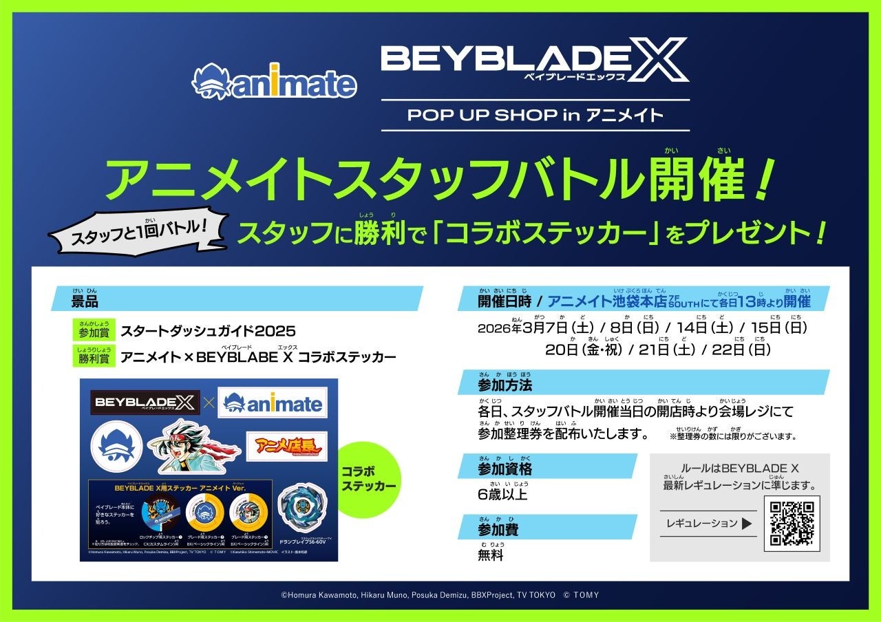 これまで大好評だった「スタッフバトル」は今回も実施。アニメイトスタッフと1回バトルをして見事勝利すると、アニメイトロゴやアニメ店長がデザインされた「BEYBLADE X アニメイト コラボステッカー」をゲット!