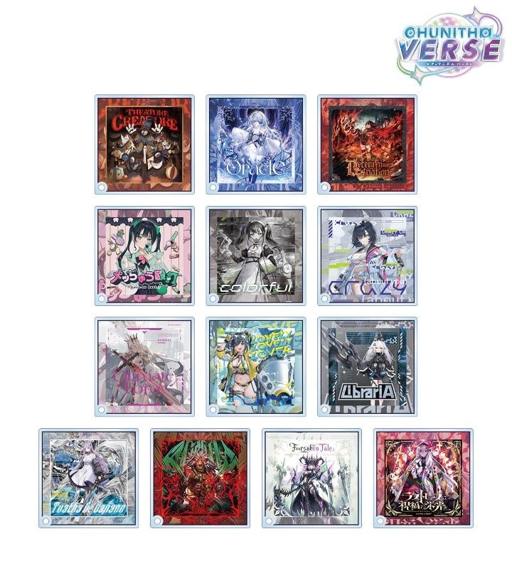 Theatore Creatore、Oracle、〚隔絶〛 ~Flame of Determination、メッちゅう殴打、colorful、crazy (about you)、Ultimate Force、Lovely Lovely Lover、LibrariA、Tuatha Dé Danann、Acid God、Forsaken Tale、ラストピースに祝福と栄光をの楽曲ジャケットイラストを手のひらサイズのアクリルパネルに仕上げました。