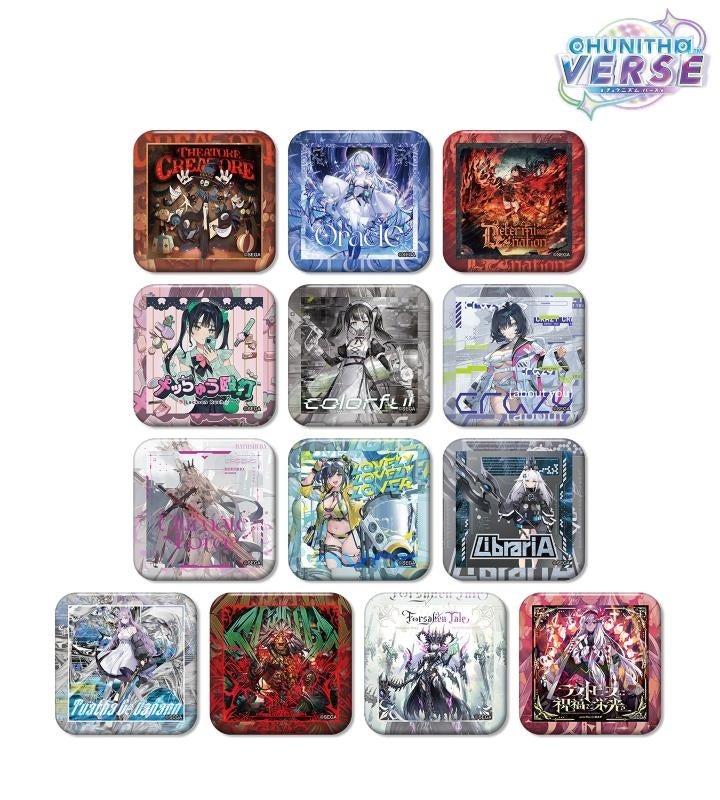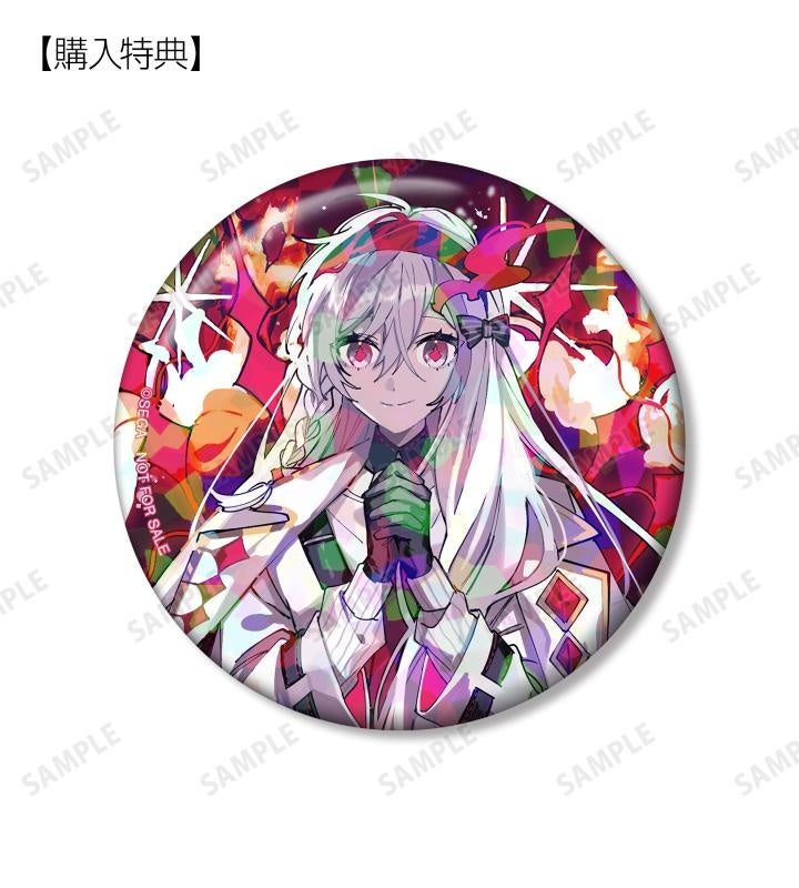 Theatore Creatore、Oracle、〚隔絶〛 ~Flame of Determination、メッちゅう殴打、colorful、crazy (about you)、Ultimate Force、Lovely Lovely Lover、LibrariA、Tuatha Dé Danann、Acid God、Forsaken Tale、ラストピースに祝福と栄光をの楽曲ジャケットイラストをスクエア缶バッジに仕上げました。