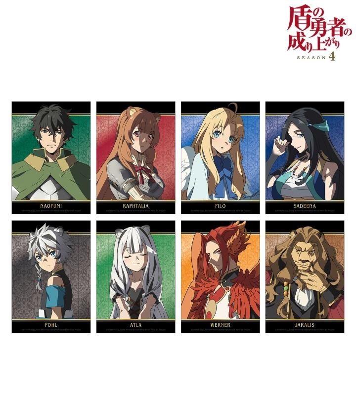 岩谷尚文、ラフタリア、フィーロ、サディナ、フォウル、アトラ、ヴァルナール、ジャラリスのイラストをブロマイドに仕上げました。