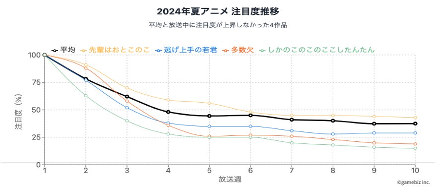 一方で、放送中に注目度がほとんど上昇しなかったタイトルも存在します。