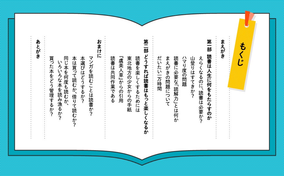 子どもが本を読まない、本を読む気力がわかない、本の面白さがわからない……など、読書に対するさまざまなお悩みに、40年にわたり作品を生み出してきたベストセラー作家である著者が答えます。読書がもっと気楽で楽しいものになる、新感覚の読書の指南書です。「読書は書き手と読み手の共同作業」「本は最後まで読まなくていい」など、今までの読書のイメージが覆る、おもしろく読むための思考法が盛りだくさんです。
