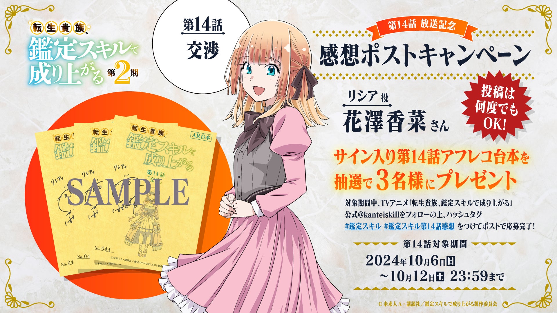 TVアニメ『転生貴族、鑑定スキルで成り上がる 第2期』第14話(第2期2話目)放送を記念して、リシア・プレイド役 花澤香菜さんのサイン入り第14話台本を、3名様にプレゼントいたします。