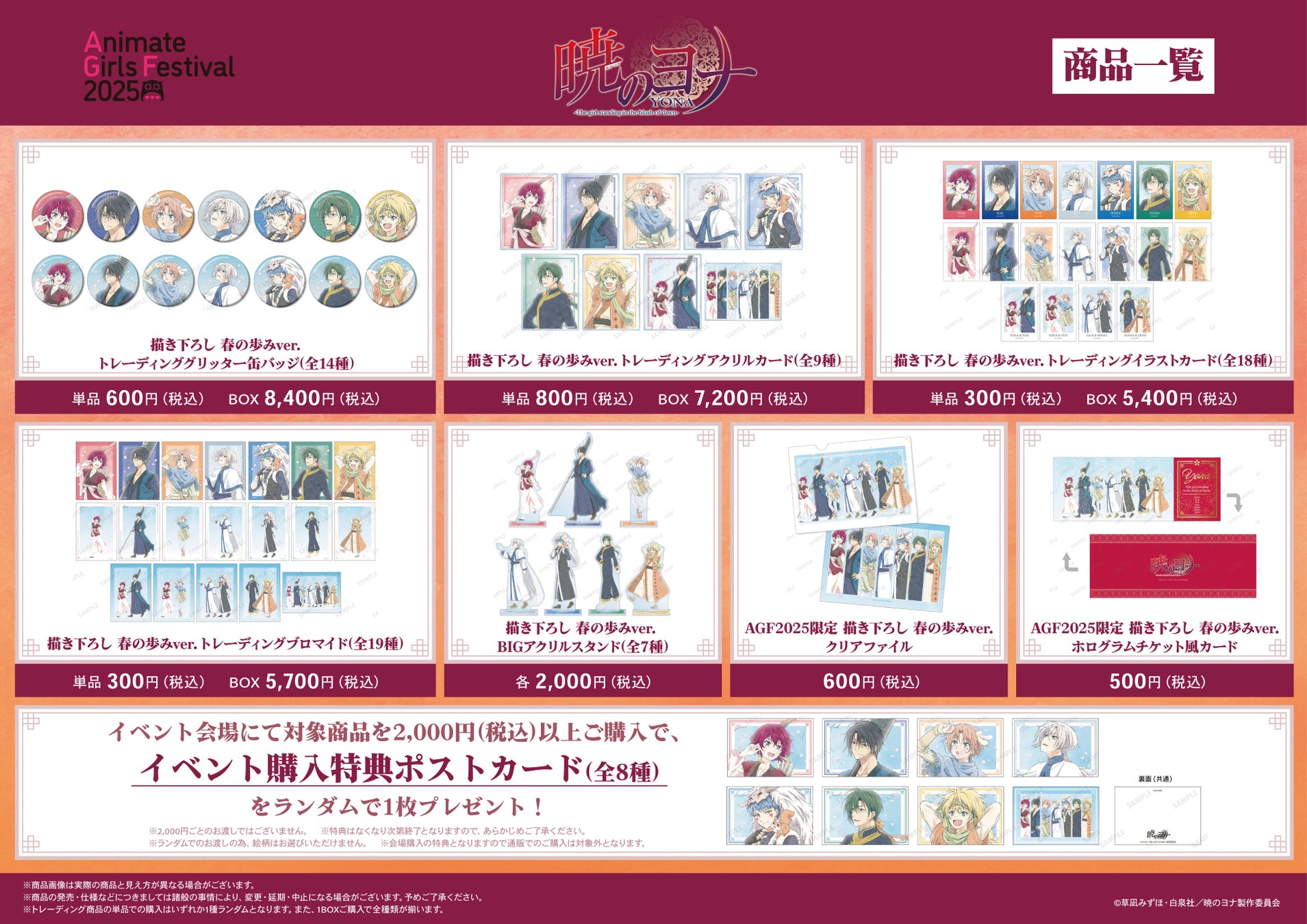イベント会場にて、テレビアニメ『暁のヨナ』の関連商品を2,000円(税込)以上ご購入で、「イベント購入特典ポストカード(全8種)」をランダムで1枚プレゼント!(※2,000円ごとのお渡しではございません。)