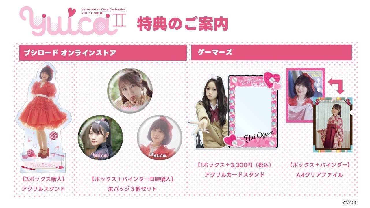 さらに「当日窓口販売」にて、5,000円(税込)以上ご購入のお客様に入場時全員プレゼントの会場限定「Voice Actor Card Collection VOL.14 小倉 唯『YuicaⅡ~もしも小倉 唯がタイムリープしたら~』EXカード」をもう1枚プレゼント!