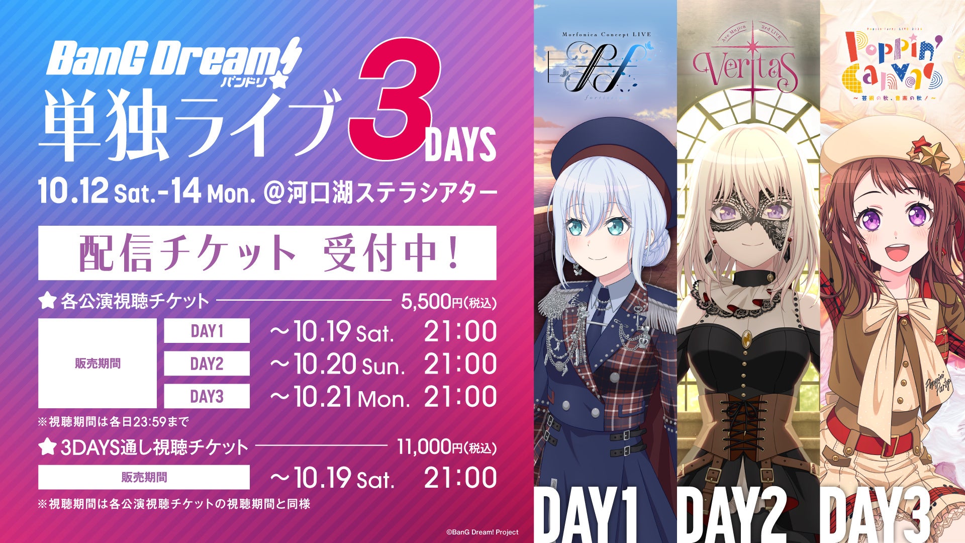 2公演分の価格で、Ave Mujica 3rd LIVE「Veritas」、Poppin'Party LIVE 2024「Poppin'Canvas 〜芸術の秋、音楽の秋!〜」を含む3公演いずれも視聴いただけるチケットです。