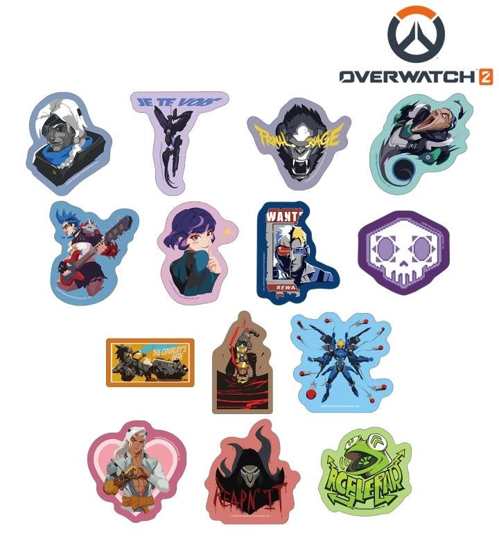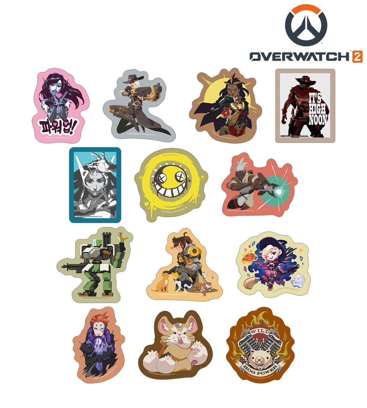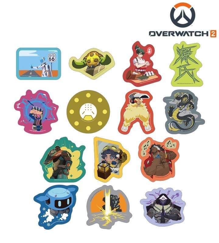 D.Va、アッシュ、イラリー、キャスディ、シンメトラ、ジャンクラット、ソジョーン、バスティオン、ブリギッテ、マーシー、モイラ、レッキング・ボール、ロードホッグのイラストをダイカットのステッカーに仕上げました。