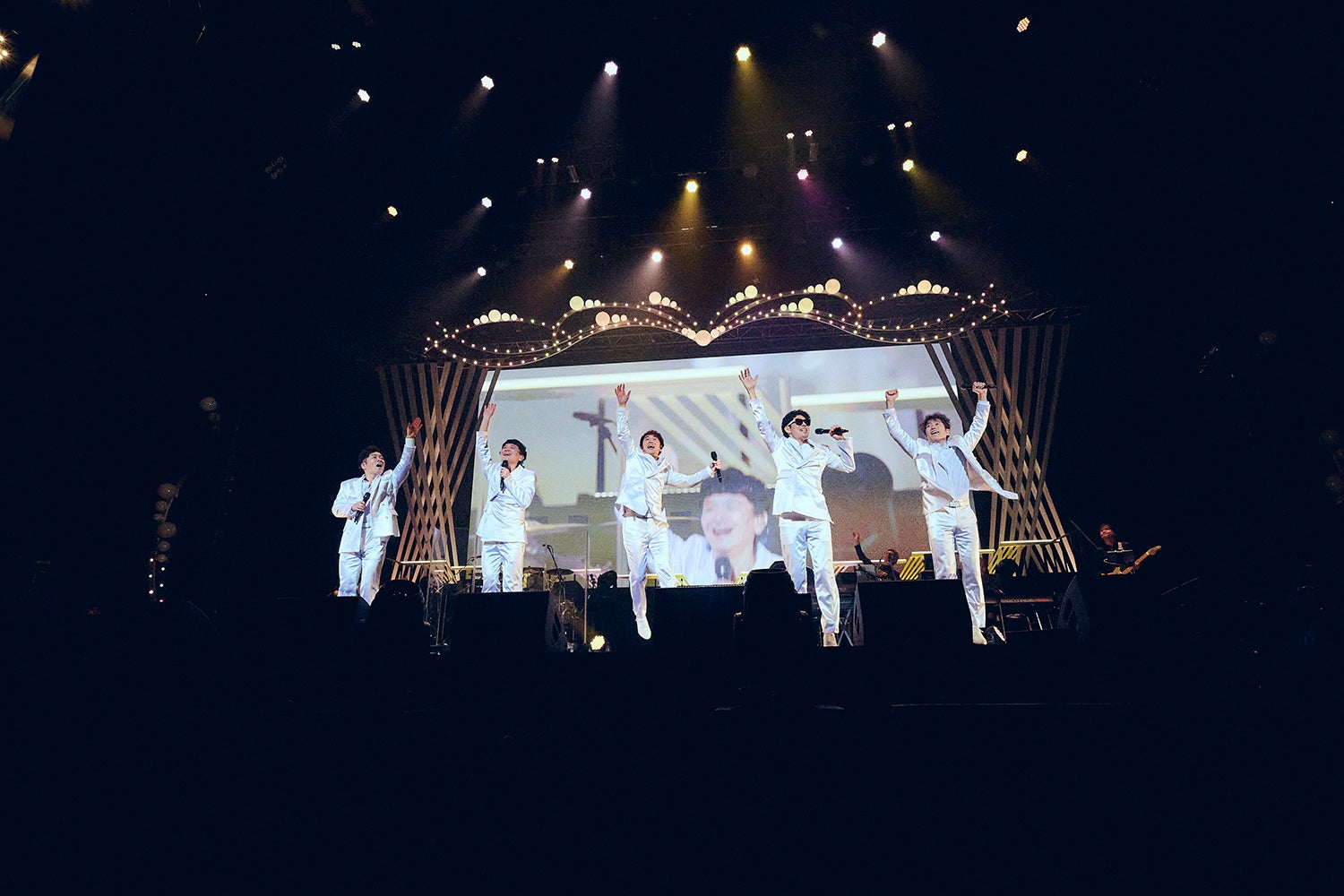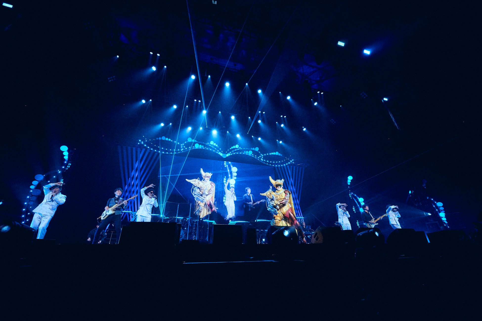 休憩時間を経て、彼らは白いスーツへと着替えて再びステージへ。重ねてきた時間と空間を再共有する夜が更けていく。20周年ベストアルバム『G20』でファン投票1位を獲得した「1, 2, 3 for 5」は、酒井雄二のクリスタルヴォイスがリードするゴキゲンなダンスチューン。そして、ハイライトはやはり「愛の歌」だった。コロナ禍では出来なかった“La la la... 聞かせて”の大合唱で、あふれるエモーションを交感する。誰もが幾多の苦難を乗り越え、ひとりひとり“それぞれの生”を重ねている。その喜びを共有するまさにこの瞬間のために、「多幸感」という言葉があると感じ入った。