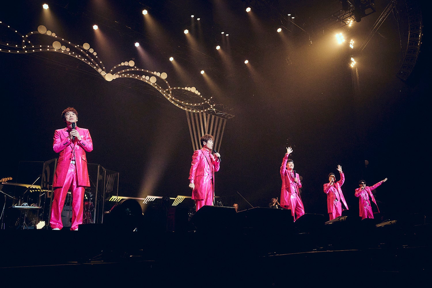 定刻を迎えて場内が暗転すると、スモークが立ち上るステージに5人のシルエットが現われる。中央に立つリーダー村上てつやの歌い出しで、代表曲「ひとり」をアカペラで披露する。エモーショナルな歌声と真骨頂とも言えるファルセットに4人のコーラスが寄り添う。一転して、グルーヴィなサウンドの「靴は履いたまま」「一筋の軌跡」へ。それぞれがフレーズを歌い分けることで、より多面的な表情を魅せるゴスペラーズの音楽の扉が開かれる。ハンドマイクを手に踊る彼らは、お揃いのピンクのスーツ姿。銀色のテープや鮮やかなレーザービームがステージに彩りを加えていく。