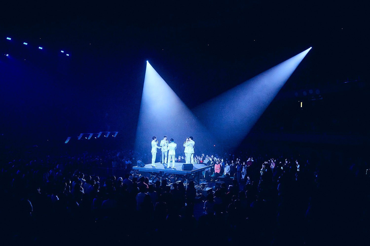 シングルのカップリング曲をフィーチャーしたコーナーも素晴らしかった。長きにわたり聴き継がれてきたラブソング「砂時計」、北山陽一のハイトーンが響き渡った「東京スヰート」。吐息の白さまで伝わるような切なさを見事に綴っていた。続いて、白熱のメドレーコーナーへ。1995年から2000年までに発表された各アルバムから懐かしい楽曲を連ねていく。メジャーデビューアルバム『The Gospellers』収録曲「Tonight」、安岡 優のビブラートするメロウなヴォーカルがキュートな「それでも恋はやってくる」、初めてチャートの上位にその名を連ねた6枚目のアルバム『Soul Serenade』から「Slow Luv」。足跡を共に辿り、深い感慨を噛みしめる至福のひとときを味わった。