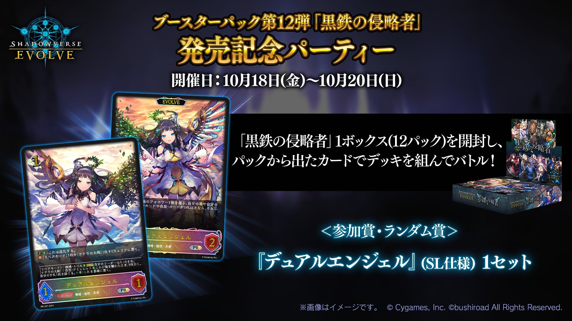 ブースターパック第12弾「黒鉄の侵略者」を1ボックス(12パック)開封し、パックから出たカードで30枚以上のデッキを構築して戦う、通常大会とは構築条件が異なる、特別なあそびかたができるイベントです。参加賞やランダム賞としてPRカード『デュアルエンジェル』(SL仕様)を進化前後1枚ずつプレゼントします。