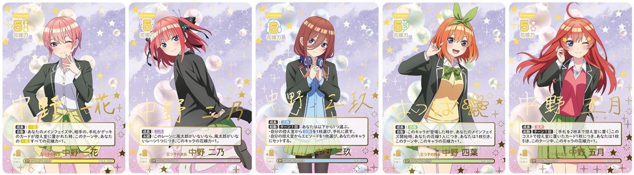 『五等分の花嫁』原作者・春場ねぎ 原案/監修のもと、TVアニメ放送5周年記念商品としてブシロードが贈る新作オリジナルトレーディングカードゲームです。原作やアニメイラスト、様々なイラストレーターの描き下ろしイラストを収録したコレクション性の高い商品となっております。