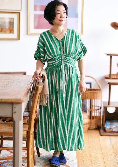 はっと目を惹く魅力を放つヌキテパのワンピース。見た目の素敵さはもちろんのこと、軽くて柔らかな着心地は目の肥えたミドル世代にきっとご満足いただけるはず。「グリーン」はGOROGORO BOUTIQUEとヌキテパ直営店のみの限定販売中です。
