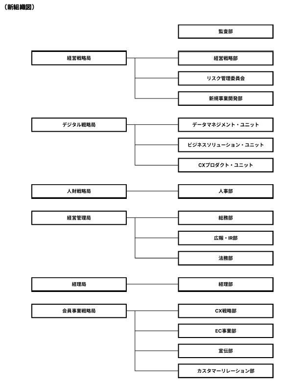 ・「事業戦略局」を「会員事業戦略局」と改め、「CX戦略部」「EC事業部」「宣伝部」「カスタマーリレーション部」を管轄する。会員事業のマーケット理解に基づいた顧客体験の設計、多層化サービスの開発とインキュベーション、顧客とのコミュニケーション改革を図る。