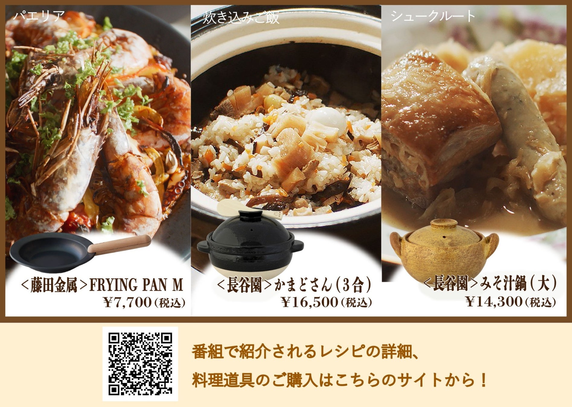 これまでに、第1回「毎日焼きたくなる玉子焼き」、第2回「手仕事のおろし金と、ポタージュ(かぶのポタージュ)」、第3回「おうち、手打ち、パスタ(カルボナーラ)」が放送・配信され好評を得た。3月は、藤田金属の鉄フライパン「FRYING PAN JIU M」で作る具だくさんパエリア、長谷園の土鍋「かまどさん」でつくる中華風炊き込みご飯、同社の「みそ汁鍋」でつくるアルザス風シュークルートを麻生が紹介していく。番組は好評につきYouTubeでも全篇配信中。各回放送終了後より最新回が公開となる。
