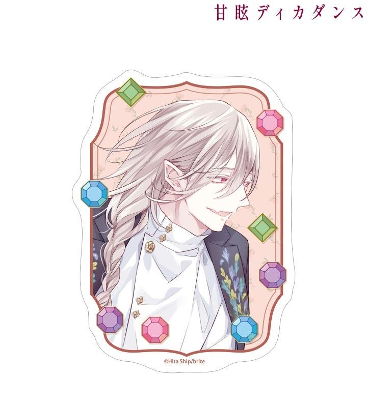緋汰しっぷ先生描き下ろしイラストのロズ、ユイネをお花と宝石風の飾りと組み合わせ、ダイカットのステッカーに仕上げました。