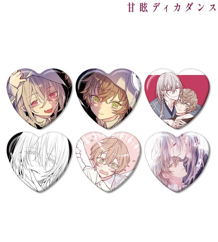ロズ、ユイネの原作イラスト、原作コマイラストをハート型の缶バッジに仕上げました。